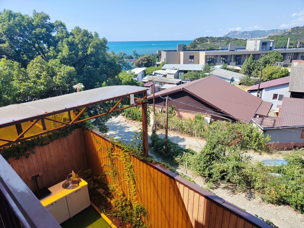 Море в шаговой доступности, терраса с видом на море ( унас был полулюкс). Комната большая — есть холодильник, шкаф с полотенцами и одеялом, сплит система, душевая с унитазом в номере, микроволновка, чайник на террасе сушилки и столики. Хозяйка приветливая, все понравилось, вернемся еще не раз!!!