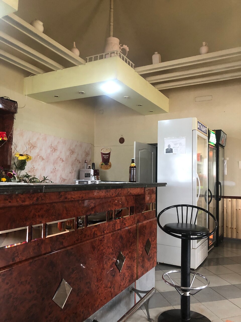 В кафе не была, гостиница просто треш. Белье пахнет затхлым, матрасы все продавленные, телевизор есть но не работает, кондиционер есть но пульта нет. В сан узле страшно вставать в ванную без обуви, однако есть шампунь, мыло, гель для душа. В номере в целом ‘воняет’ старым застиранным бельем. Если совсем негде переночевать в дороге, наверно это лучше чем спать в машине. Но если есть выбор не рекомендую