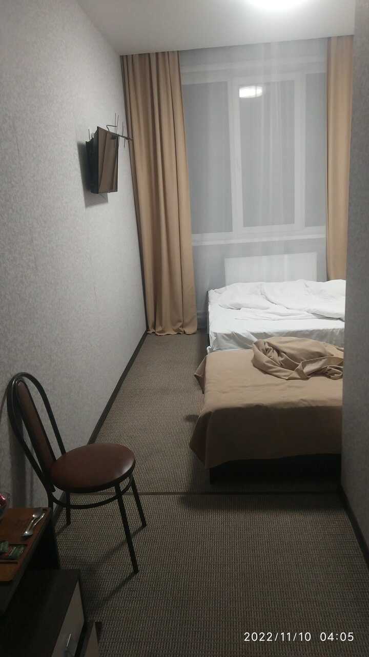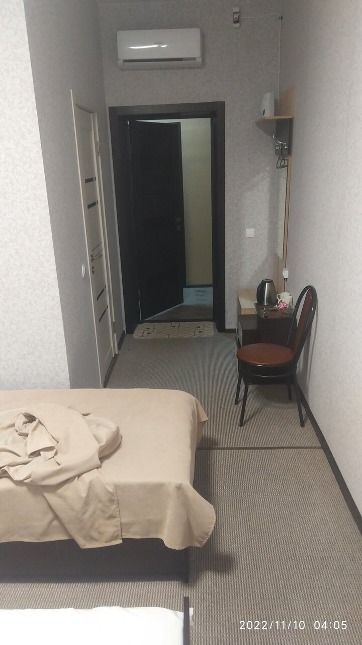 Остановились в этом отеле на одну ночь. Номер на троих: душевые принадлежности на одного человека, стаканы для чая для двоих, в номере душно, в коридоре темно, персонал не приветливый, в душевой вода уходит плохо, дверка душевой задевает за вешалку для полотенец, надо открывать осторожно, чтоб не разбить, оплата только наличными или переводом, документы об оплате не выдают, чистоту не радует, в тумбочке обертки от шоколадок от прошлых постояльцев, кухня обыкновенная. Больше всего поразила конструкция под потолком в коридоре, фото прикладываю, очень ужасающе, не совсем понятно для чего она, видимо держит стены, увидела только утром, так бы ночевать не остались.