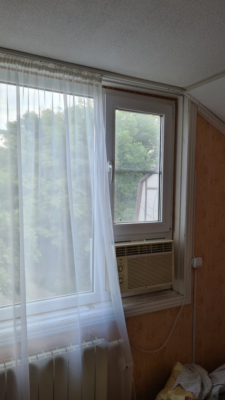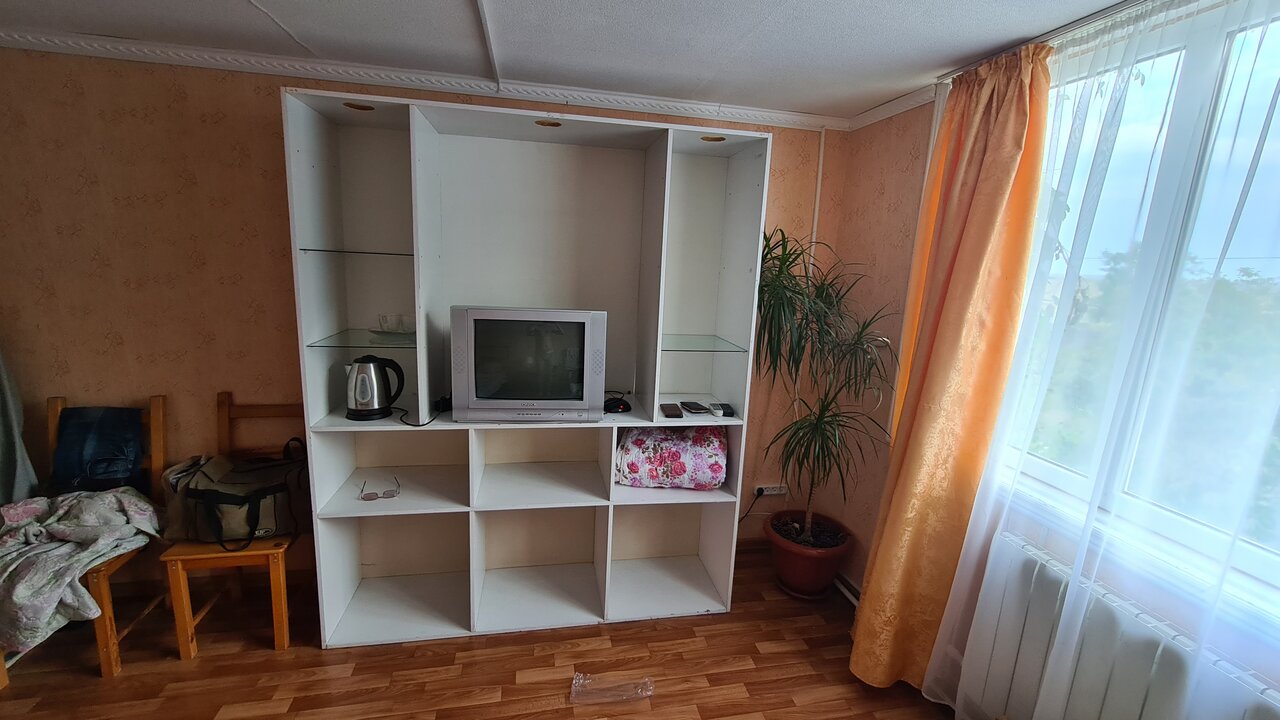 - Устаревшая мебель, окна заклеены плёнкой.