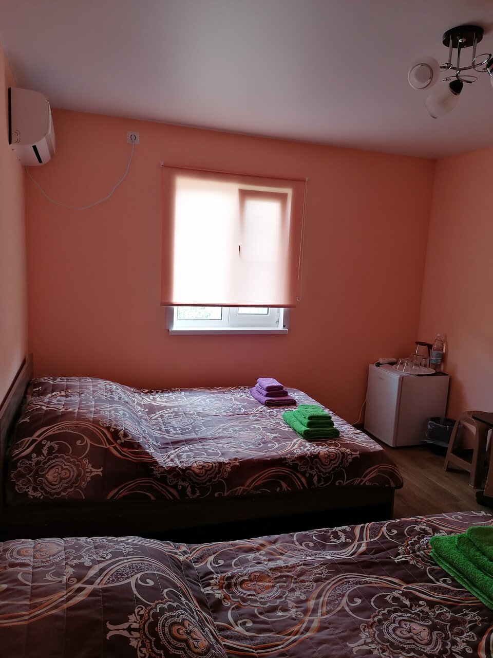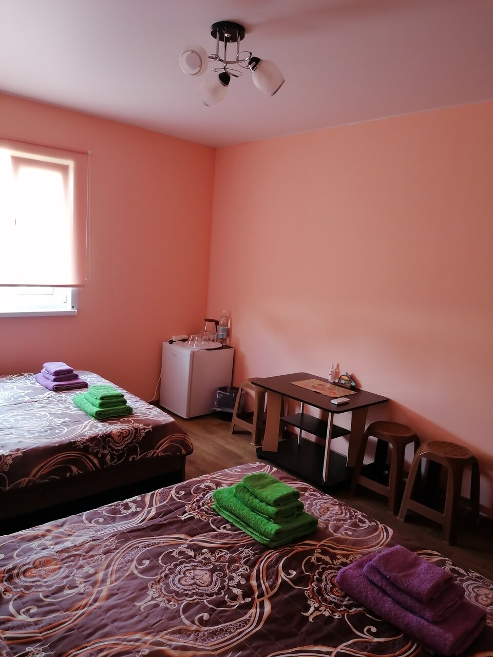 Новый чистый гостевой дом. Три комнаты, туалет, душевая кабина. Снимали номер на троих за 2000р. В номере тв,чайник, микроволновка, холодильник,кондиционер, обогреватель. Заранее позвонили , забронировали. Рекомендую.