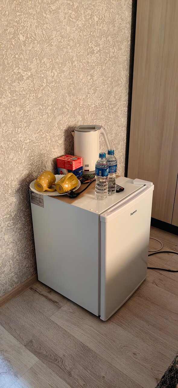 С виду отель очень неприметный и скорее аызывает отторжение, кажеться ночлежка,но не пугайтесь, внешность обманчива. Внутри вас будут ждать абсолютно новые номера, со всем необходимым! Свежий ремонт и хорошо пахнет. В номере: холодильник, чацник, чашки, чайный набор, вода ( две бутылки по 0.5). Ванная новая свежая в ней: мыльные принадлежности, мягкая туалетная бумага, полотенца по количеству проживающих ( большое+ маленькое), держатель для душа( для моего мужа это важно), активная вытяжка. Постельное белье чистое новое, хлопок!! Одеяла тоже новые в номере 3 одеяла, два в шкафу, и одно под доп местом , там же постельное белье для доп места. Телевизор работает исправно, кондей тоже, батареи жарят) свет в ваной и в комнате двухуровневый. Звукоизоляция отличная. Вообщем чтобы переночевать с дороги самое то! Хотелось бы столовую но ее нет, как и приотельной территории. Есть палатка с бесплатной доставкой еды, прейскурант в номере.