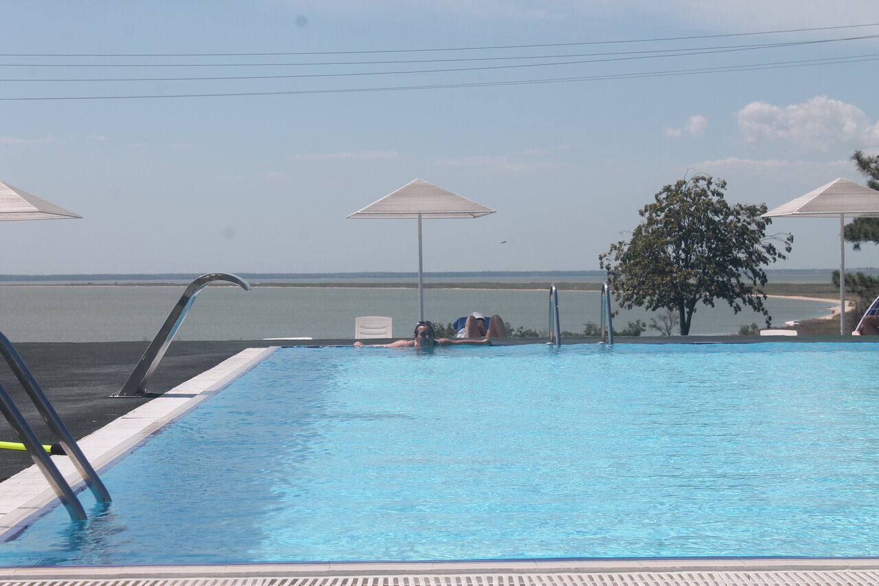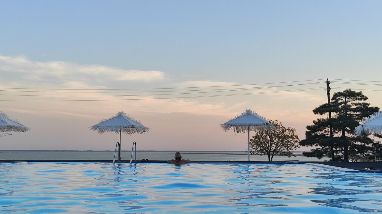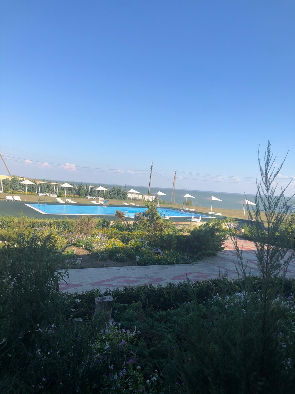 Пансионат очень приятный: достаточно свежий ремонт, большая ухоженная территория, персонал вежливый, в номерах убирают ежедневно, еда вкусная. Замечательный бассейн! Рядом находится муниципальный пляж с бесплатными лежаками. Море, конечно, очень мелкое и мутное, но это предсказуемо))) Зато тёплое и детям нравится. Людей на пляже мало, просторно Особенно рекомендую социофобам