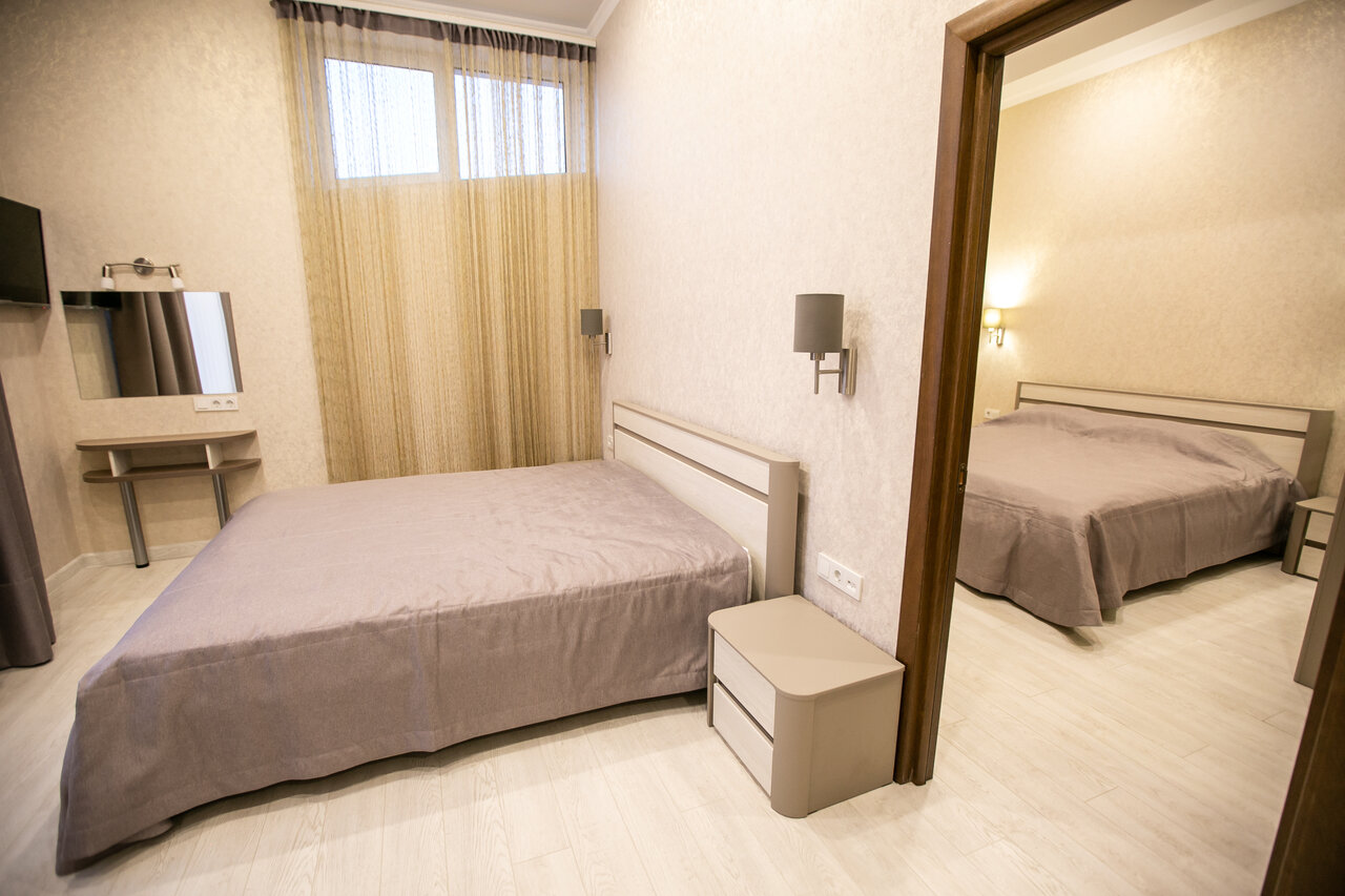 Номер со всем необходимым для комфортного проживания. Кондиционер,телевизор, ванная комната в номере. Две раздельные кровати могут быть объединены в одну двухспальную