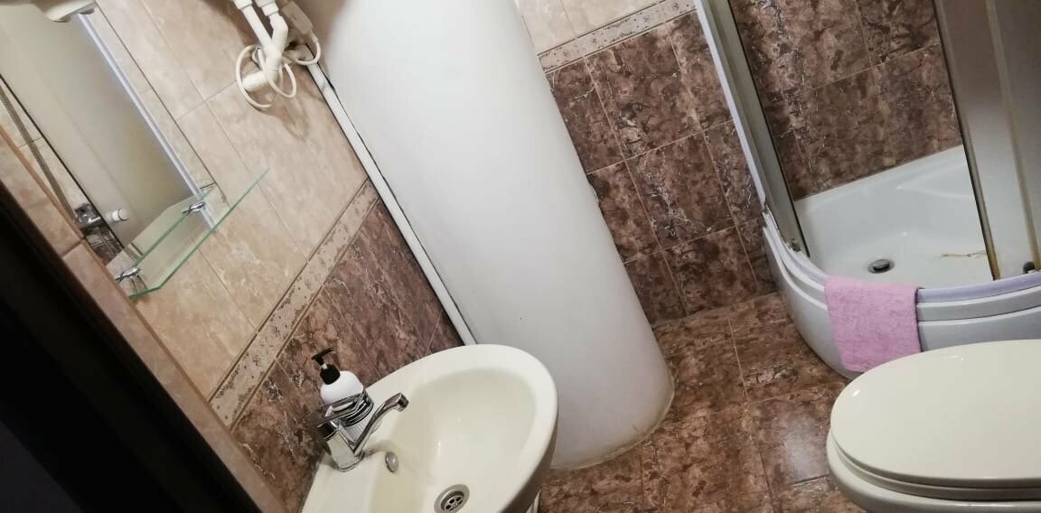 номер эконом 3-х местный, общий санузел с душевой кабиной на против номера. В номере 1 односпальная кровать и 1 двухспальная кровать, телевизор, тапки, полотенца, Wi-Fi. Без окна
