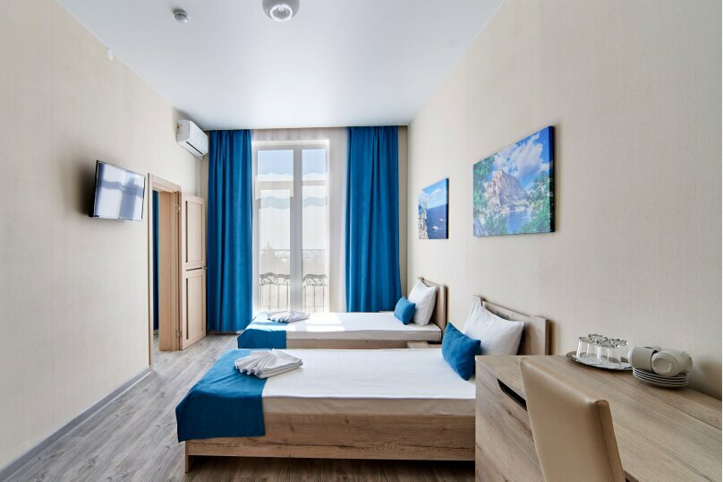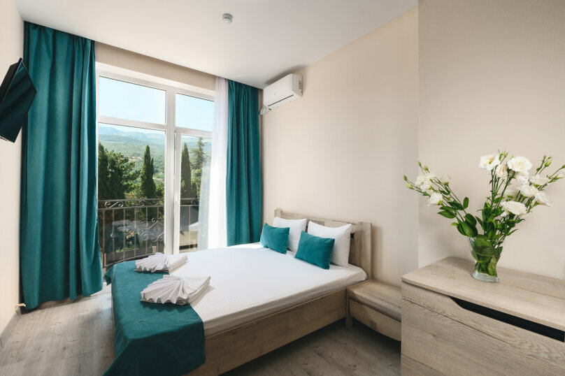 Небольшой номер, расположенный на втором этаже с двуспальной кроватью, с шикарнейшим видом на гору Чатыр-Даг. Площадь номера 14м2