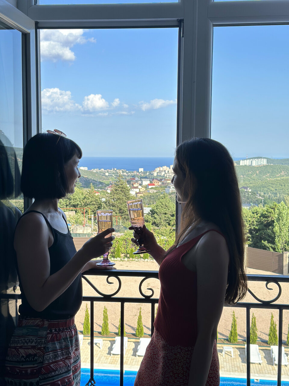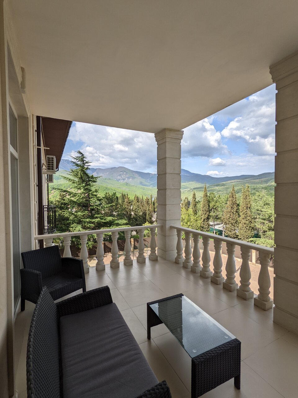 С одной стороны море, с другой стороны горы, виды потрясающие! Большая охраняемая территория, удобно приезжать на машине, чтобы отсюда стартовать на Демерджи и на соседние горы. Номера новые, очень чистые. После прогулки по хвойному лесу видимо так напитались свежим воздухом, что вырубились мгновенно. До моря тоже нормально, можно доехать на машине или на автобусе до Алушты за 10-15 минут