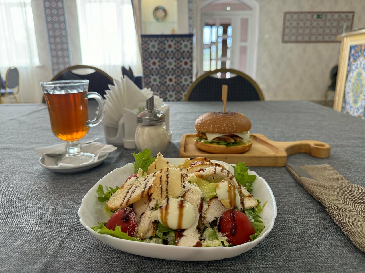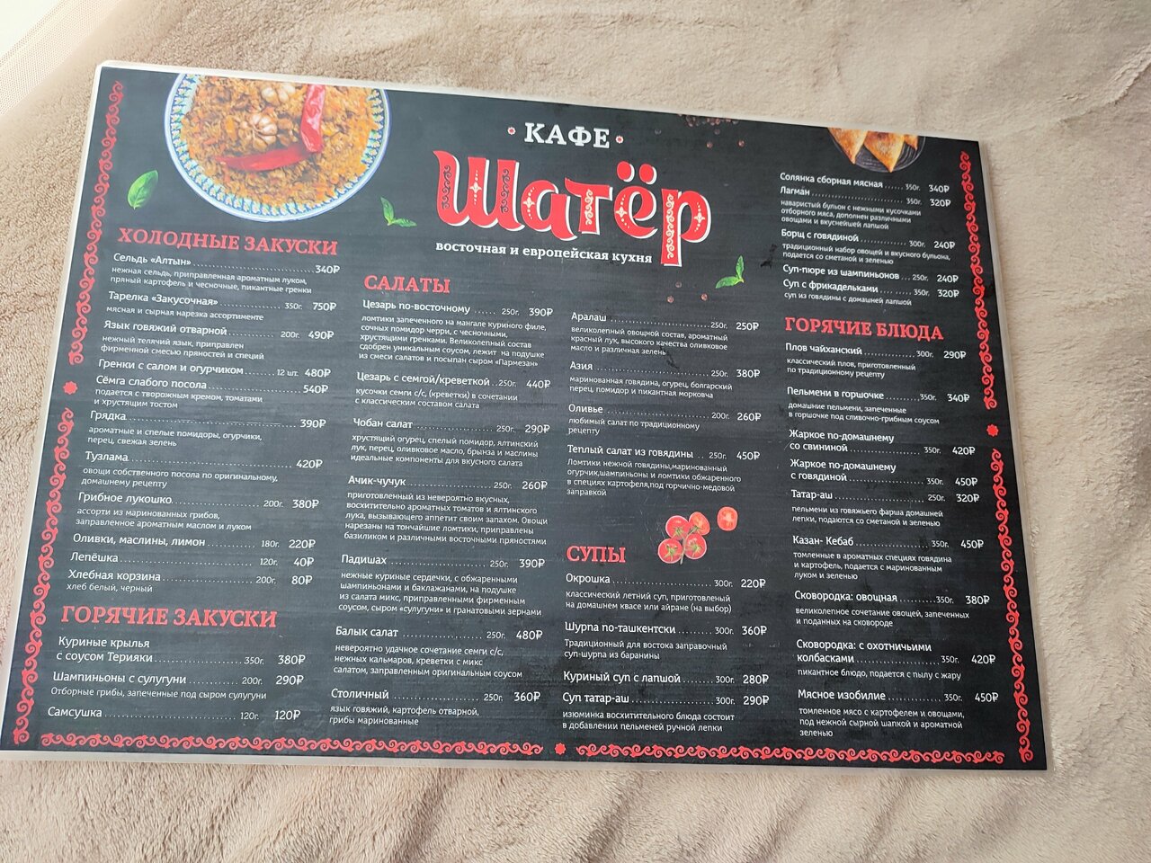 Останавливались на ночлег. Поселили в домике за кафе. Три домика, стоянка под охраной. Машина прямо перед окном, ворота автоматические. Открывают по звонку на телефон. Кафе симпатичное, тематичное на восточном стиле. Кухня вкусная. Персонал приветлевый. Только открывается с 10 утра. Завтракать пришлось по дороге.