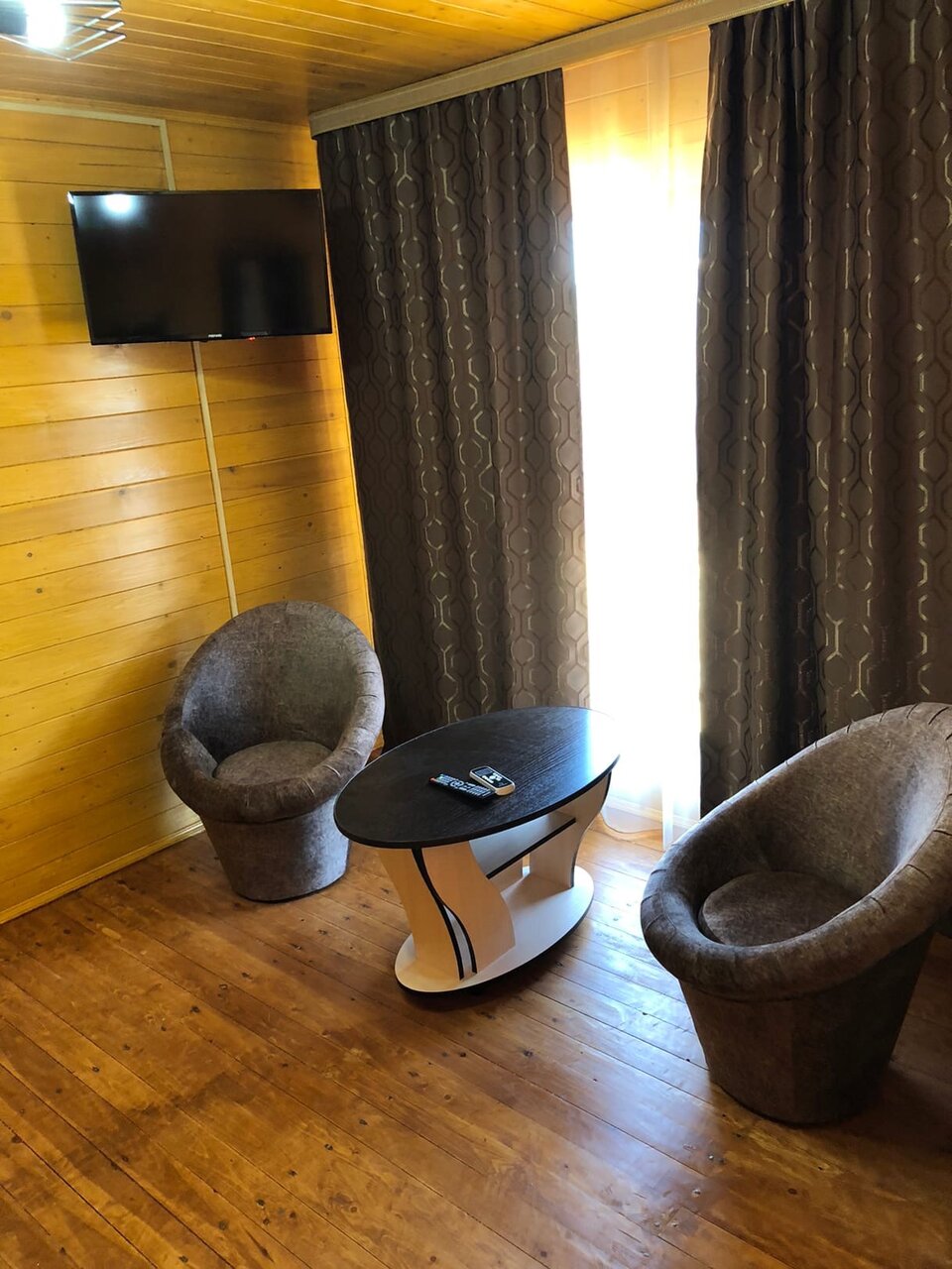 Замечательная гостиница в отдельных домиках со всеми удобствами без лишнего пафоса! Есть кондиционер, холодильник, чайник, тв, интернет, санузел нормальный, если с семьёй, то есть дополнительная односпальная кровать. Недалеко, 2 минуты ходьбы есть кафе при гостинице, где можно вкусно и сытно покушать. 5 баллов!!!