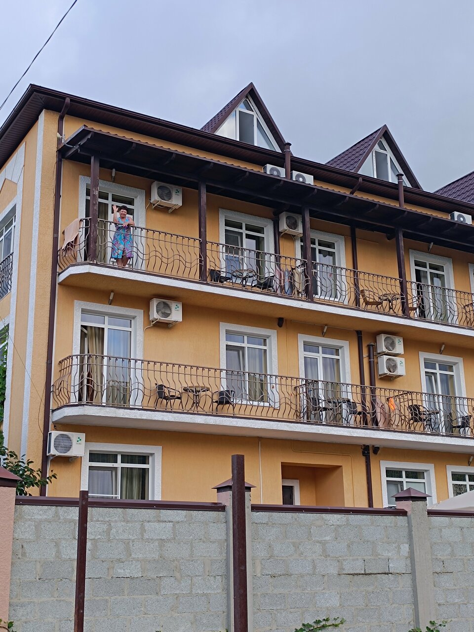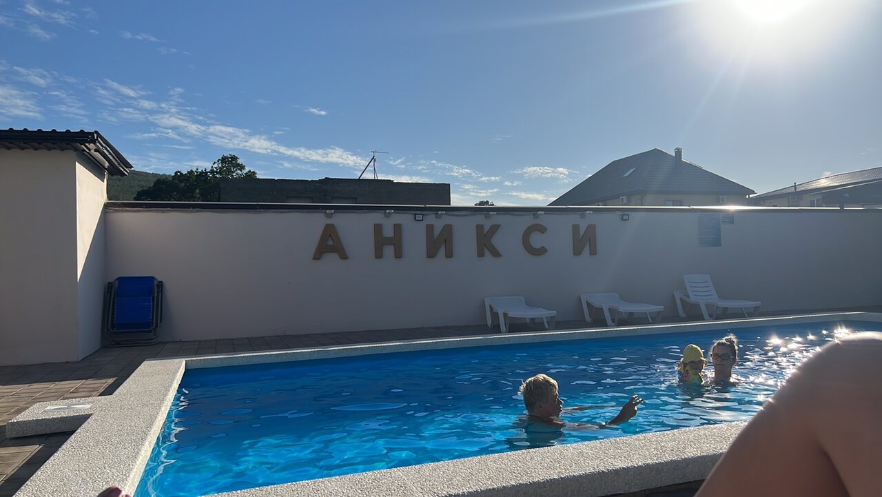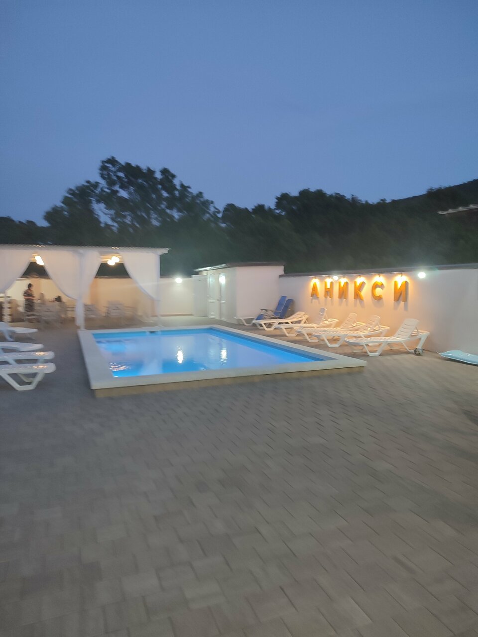 Гостиница очень хорошая.Идеальная чистота везде.В бассейне прорезиненная лесенка, идеально чистая, белая, очень удобно.Вода в бассейне подогреваемая.На кухне хороший ремонт, всё новое, в ящиках всё подписано.2 холодильника на кухне в них можно хранить продукты.В номерах тоже есть небольшой холодильник.Персонал очень доброжелательный, откликается на все просьбы.На территории очень тихо и спокойно.Магазины в шаговой доступности(пятерочка, минимаркеты).Минут 15 идти до очень вкусной столовой’Византия’.До моря далековато, путь лежит через рынок с различными товарами и сувенирами.Пляж галечный, нужна специальная обувь.