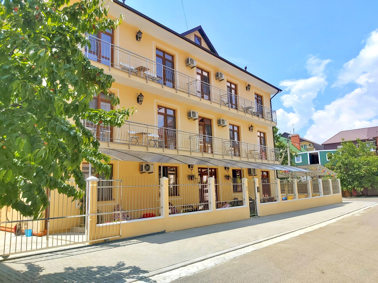 Отличный гостевой дом, все чисто и уютно, полотенца на пляж свои таскать не надо, есть детская площадка, чайная комната, а также отличный балкон. Сам гостевой дом распологается в ‘тихом переулке’, и он действительно тихий, все в пешей доступности.