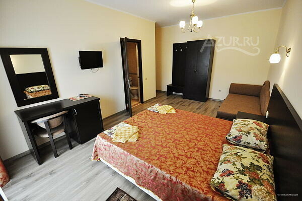 Комфортный и уютный номер для семьи! Спальных мест: 3Комнат: 1Санузел: в номереКухня: столовая на территории для заказа едыМебель: двуспальная кровать, прикроватная тумбочки, шкаф, стол, пуфик, зеркало