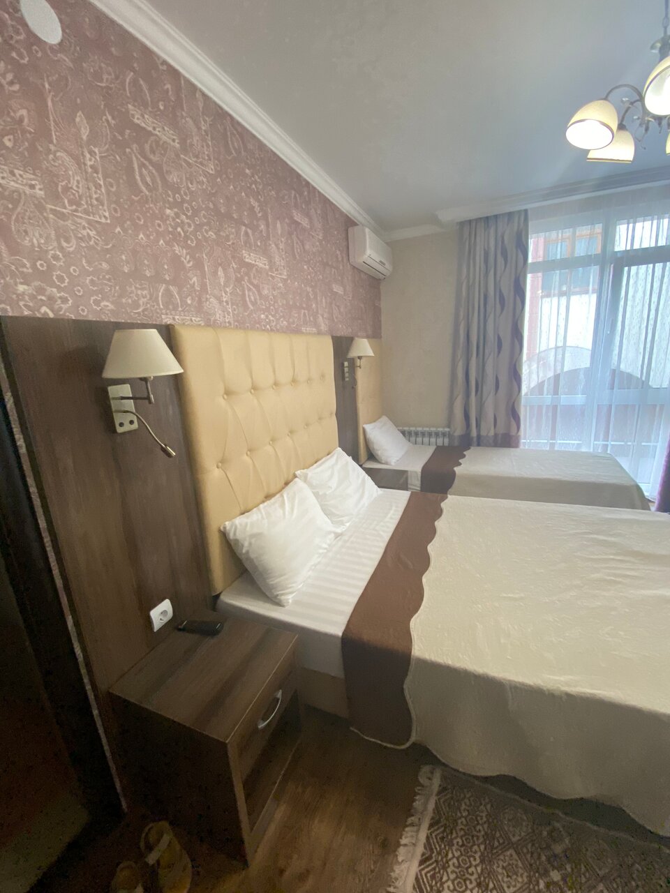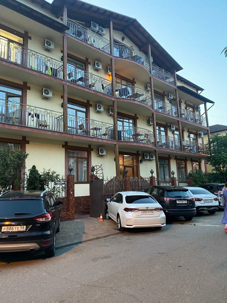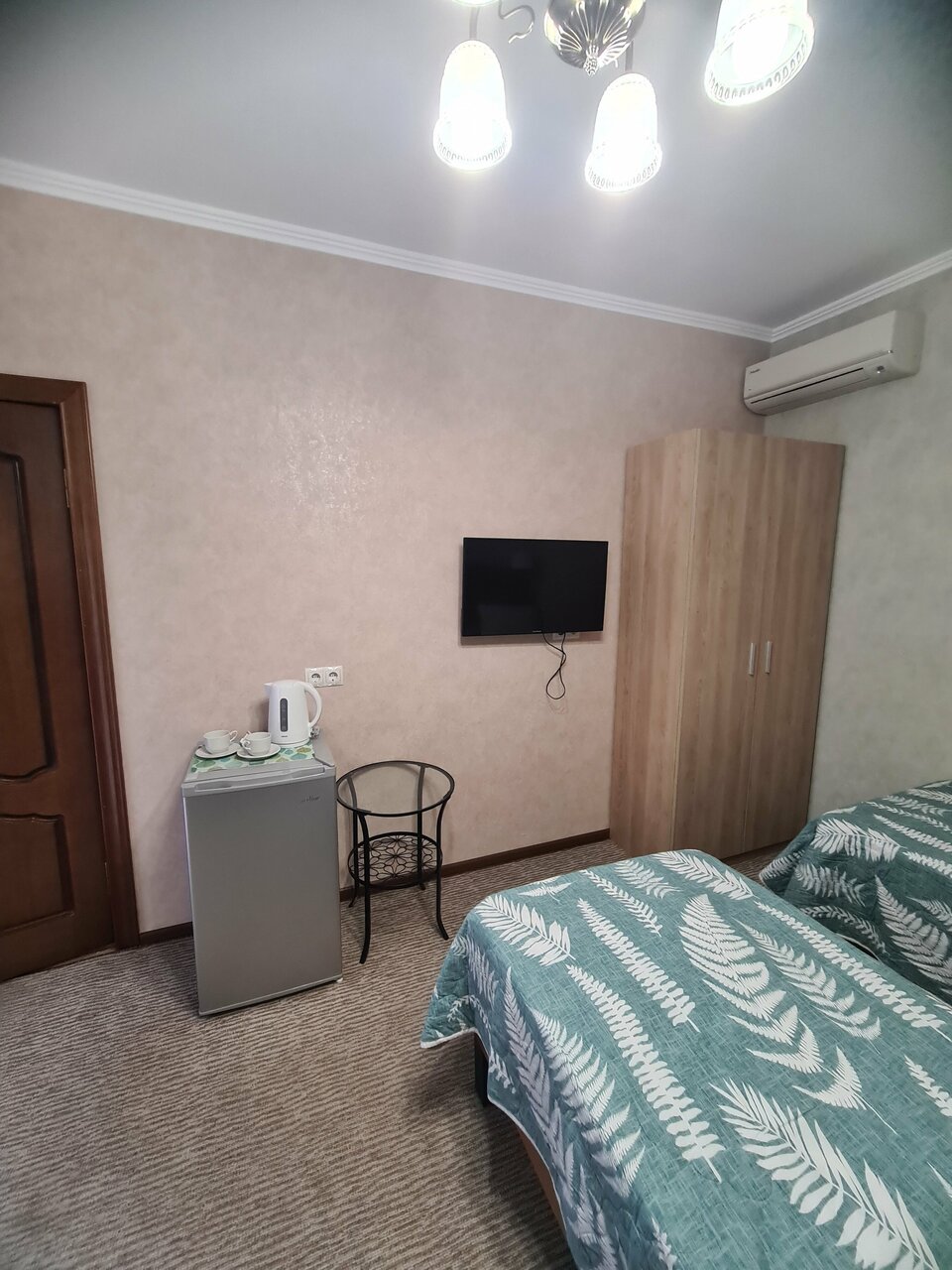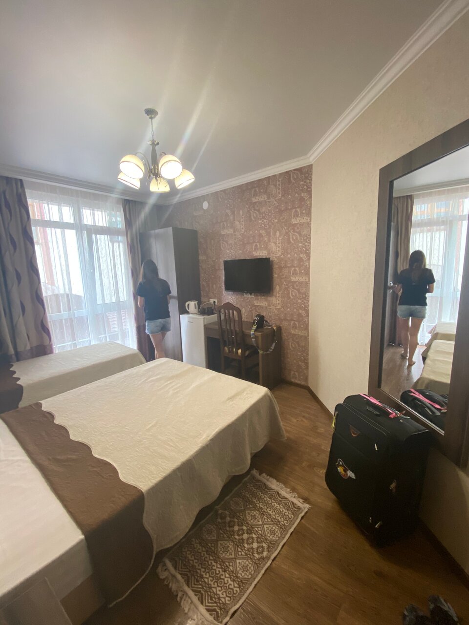 Июль 2019. 2 взрослых, 2 детей, 2 комнатный номер. В номере отличный современный ремонт, сейф, чайник, холодильник, в каждой комнате телевизор, кондиционер, туалет, душ, большой балкон, чисто, уютно, просторно. Ухоженный зелёный двор. Есть место для парковки авто. 5-7 минут ходьбы до моря. Все очень понравилось.