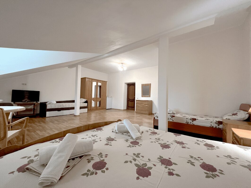 Гостиница хорошего уровня, номера с новой чистой мебелью. Хочется отметить бассейн. Большой, чистый. Пользоваться можно с утра до 22.00 без перерыва. Около бассейна беседка. Удобно отдыхать с детьми. Имеется небольшая площадка с горками и батутом. Есть все для приготовления еды: большая оборудованная кухня и чайник с микроволновкой на каждом этаже. Хозяева гостеприимные. Не хватило влажной уборки, хотя бы раз в два дня.
