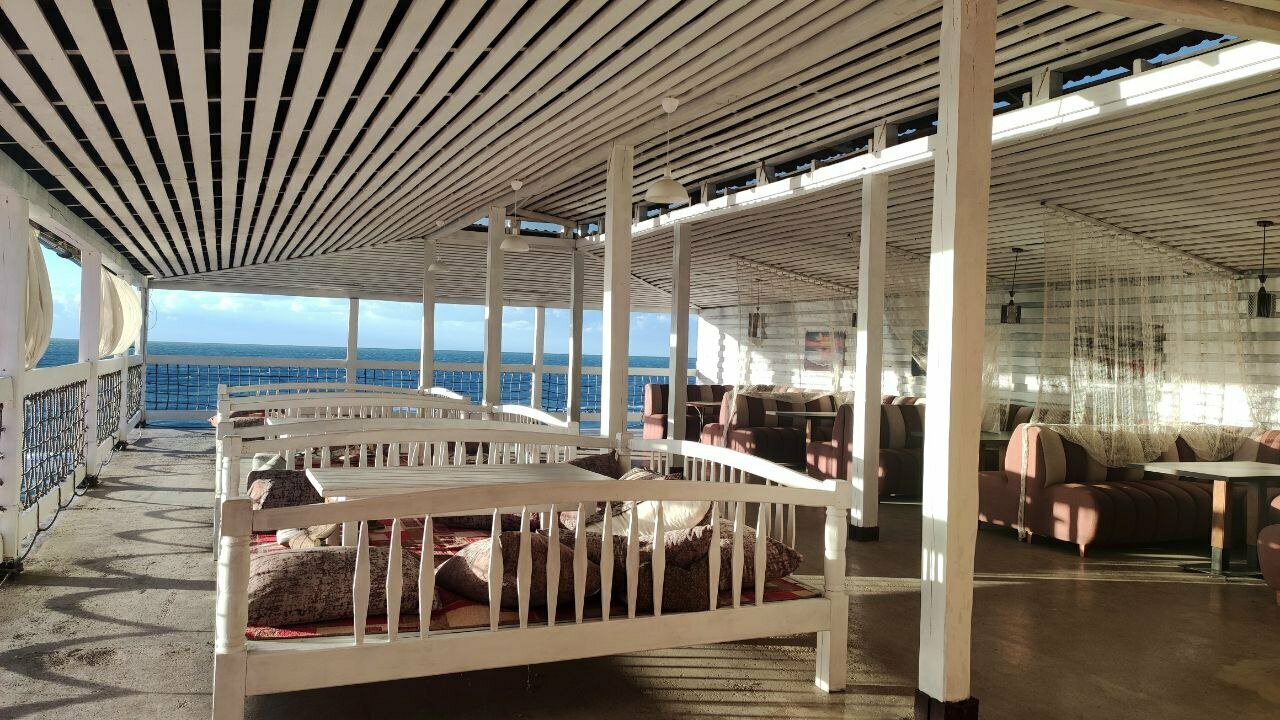 Были там в кафе. Днем нас прекрасно и очень вкусно покормили, ушли очень довольные. Вечером ждали заказ час, но не дождались и ушли. Видимо, небольшой штат и наплыв посетителей. А еще вечером была детская анимация и музыка грохотала так, что барабанные перепонки норовили лопнуть у посетителей кафе, не представляю, как на танцплощадке бедные дети не оглохли.