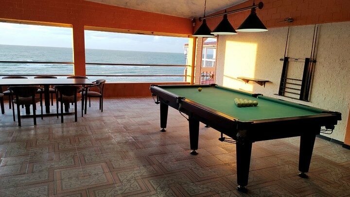 Прекрасное место для тихого семейного отдыха. Пляж ракушечный, оборудован шезлонгами и зонтиками, каждый день его убирают и чистят. На территории есть домик с шариками и горками, так же есть большой батут. Аниматорам можно поставить твёрдую пятёрку с плюсом. Для детей прекрасная программа. Утренняя гимнастика, потом мультфильмы в кинозале, вечером дискотека. Территория пансионата чистая, ухоженная, вся в цветах. Номера хорошие , есть все необходимое, уборка каждый день. Мы отдыхали дважды, на следующий год поедем обязательно