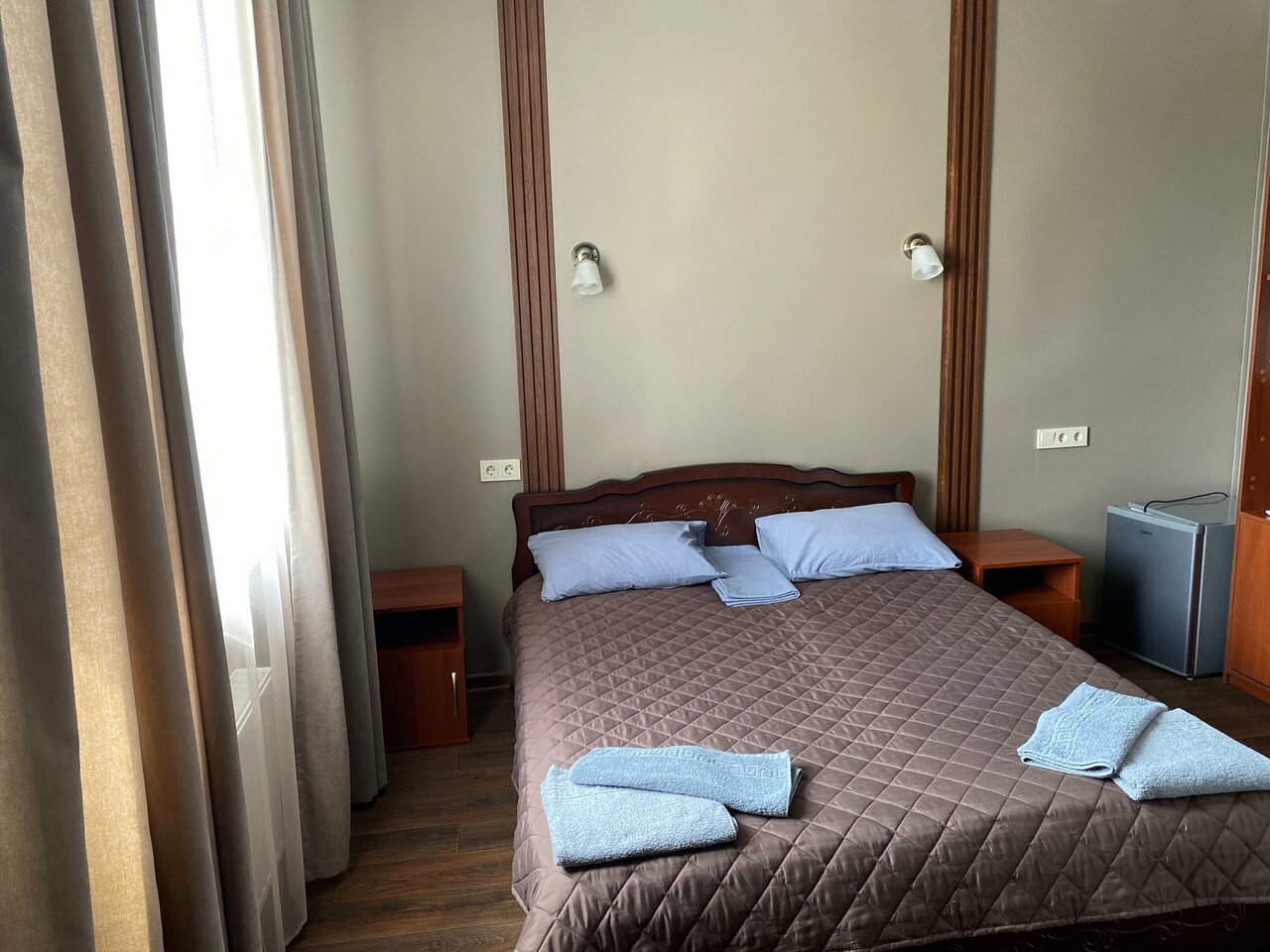 Понравился номер : чисто, просторно, удобные кровати. Тв, сплит, холодильник — всё работает. В кафе не брали ничего, но цены очень доступные, в дорогу предложили налить кипяток в термос