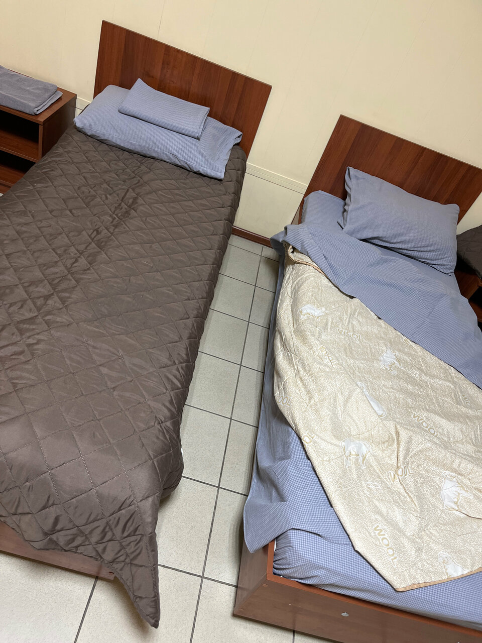 Номер на двоих,две кровати,маленький телевизор.Туалет и душ на этаже. Кровати хорошие,белья чистое,два полотенца.Переночевать,самое то. Удобно,что есть столовая,где можно поесть.