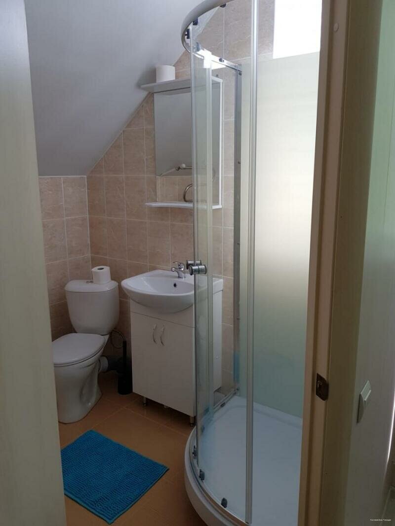 Большой просторный дом у дороги есть свой магазин продуктов огромная кухня со всеми принадлежностями можно готовить на плите есть холодильник комнаты начинаются от 1200 туалет и душ в коридоре есть комнаты со своим душем и санузлом в комнате.Всего три этажа.Было чисто,останавливались с детьми.На улице беседка для курения.Кондишка в кажлом номере.Нам очень понравилось.Отличный вариант для ночевки.