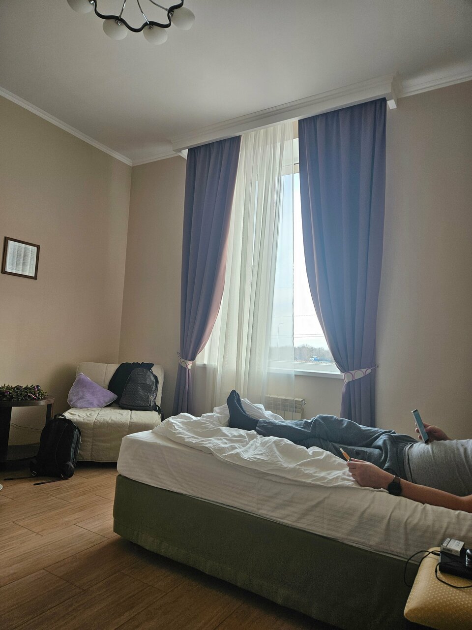 Самый главный плюс отеля — это его расположение. Находится рядом с трассой М4 Дон. Тихое уютное место со своей территорией, где можно посидеть, попить кофе, дают кормить рыбок в пруду. У нас был трёхместный номер с тремя раздельными кроватями и креслом. Номер большой, чистый, есть холодильник, чайник. Из минусов, вечером душ невозможно было настроить, шла то холодная, то горячая вода и завтрак не входит в стоимость номера, заказывали отдельно. При этом еду можно было заказать на удобное для нас время. Спасибо персоналу!