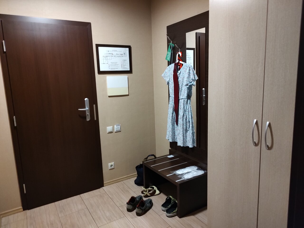 В номере две кровати, телевизор, тумбочки комод, раздевалка, две двери для лучшей шумоизоляции, санузел с душевой кабиной