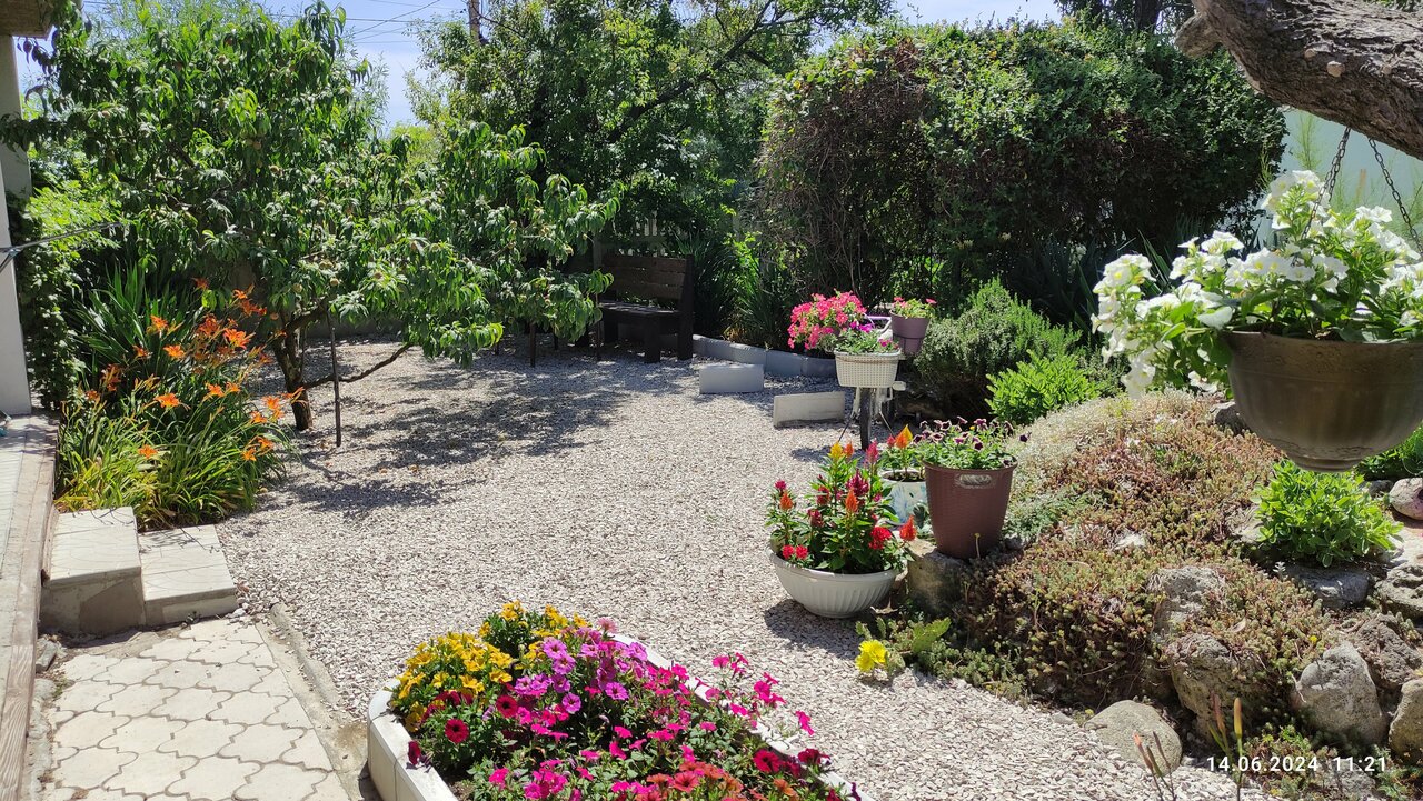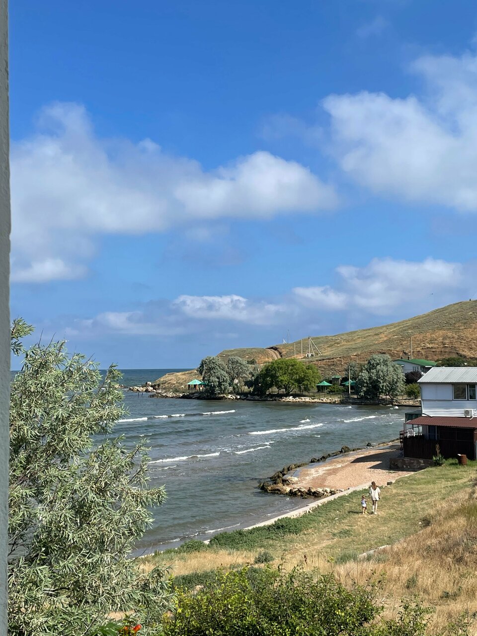 Красивый двор, весь усеян цветами, милая добродушная хозяйка Лилия Олеговна, море в 20 м за калиткой. Есть мангальная зона, есть стол, стуль перед домом. В общем много , где можно посидеть. Два пляжа, один мелкий с детьми очень удобно. Можно пройти 100м и будет по пояс, второй глубокий. В 5 км есть озеро Чокрак, известное своими полезными грязями. На одном из фото озеро и море рядом. В посёлке есть пара кафе и много магазинчик, можно не закупаться продуктами. Цены дешевле. В керчи есть магазины Народный амбар, это наши магазины Победа. Рядом керчь, можно посмотреть много достопримечательностей. А поесть можно на набережной, там есть вкусная пельменная, домашние пельмени за 100р, готовятся после заказа, очень вкусные.