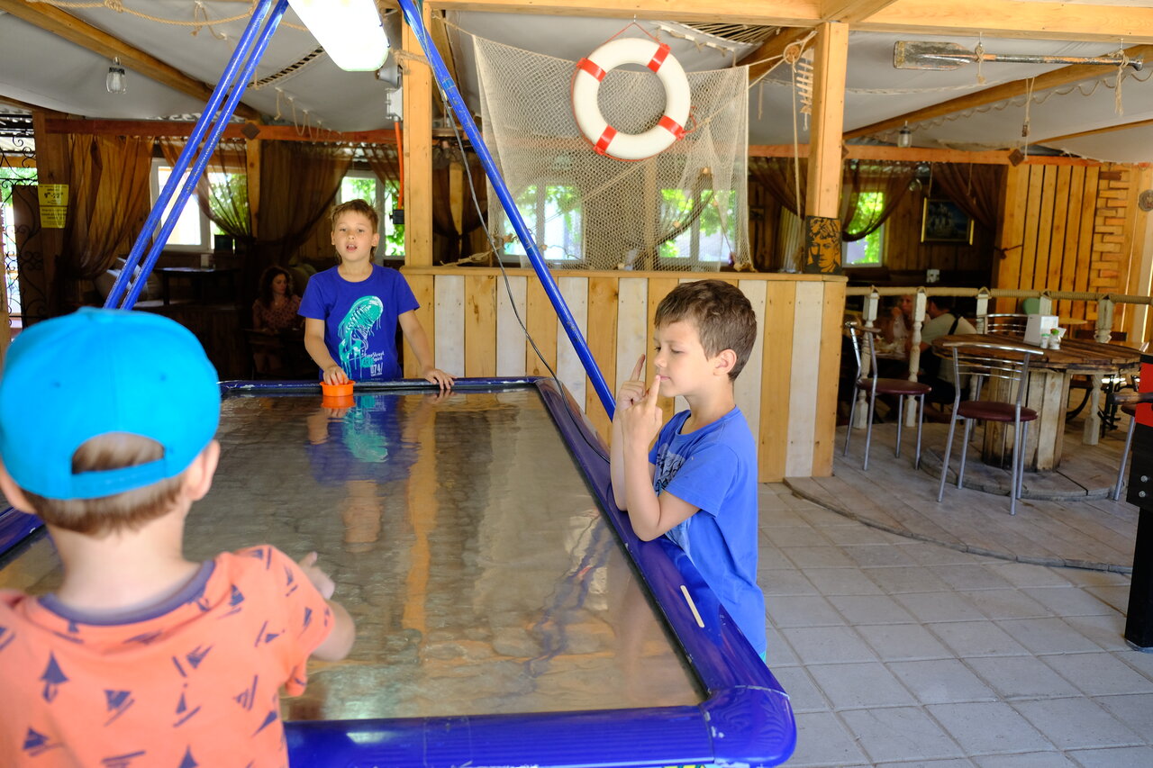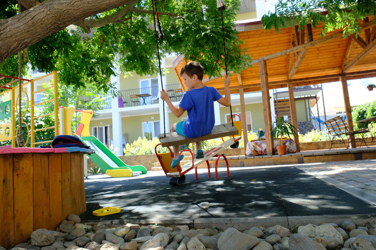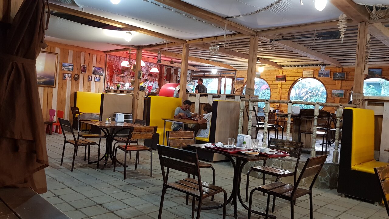 Прекрасное место для всей семьи! Как отель: душевная атмосфера, уютный двор, дети сразу же знакомятся и играют вместе, мы застали детскую дискотеку, но кажется, она бывает регулярно))) есть качели для малышей, песочница, настольный теннис, для взрослых — мангалы. Тут даже библиотека своя есть! Как кафе: очень вкусно и очень вменяемые цены! И вот ни разу, сколько мы обедали здесь, у меня не было ни одной изжоги ! Для меня это прямо показатель. Здесь готовят хороший кофе, дети в восторге от мороженого!