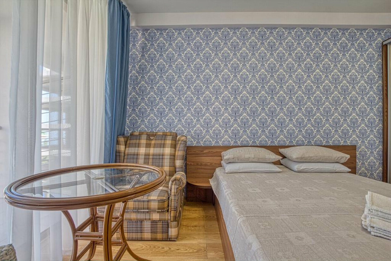 Очень уютная гостиница. Всегда чисто, уборка каждый день. Питание в уютной небольшой столовой: завтраки из 2 блюд + чай/кофе (150 ) ; обед состоит из первого, второго +салат+ компот (350); ужин — гарнир+салат+компот (300). Всё очень вкусно и по-домашнему. До пляжа — 10 минут. Выдают полотенце для пляжа и пляжный зонтик. В номере тапочки, шампунь, гель, туал. бумага, полотенца, халат, телевизор, шкаф, двуспальная кровать и кресло-кровать. На балкончике столик и 2 кресла + сушка для белья. Сотрудники гостиницы очень дружелюбные и всегда готовы помочь. Отдыхаем здесь уже второй год подряд. Стоимость в этом году осталась прежней, как в прошлом и дешевле, чем в гостиницах рядом) Впечатления от отдыха остались самые теплые и приятные. Спасибо за вкусное питание, чистый номер и приятное отношение!