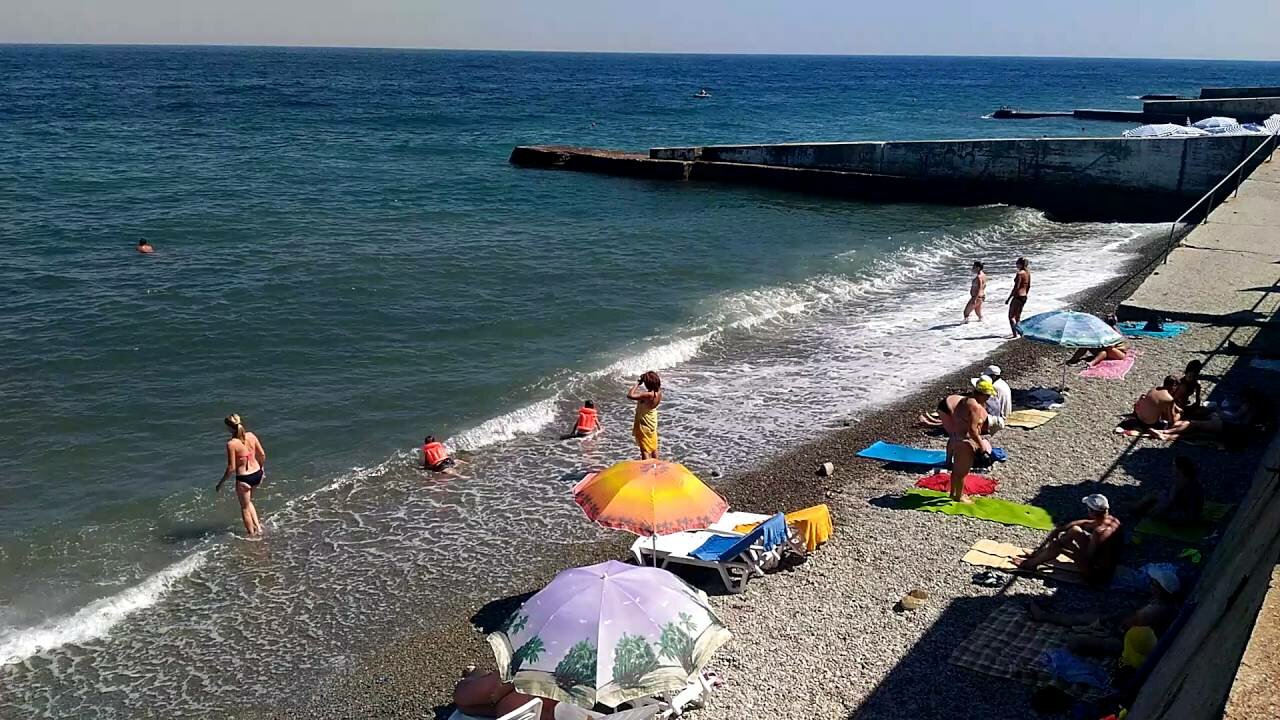 - Узкий пляж (места мало при волнах).