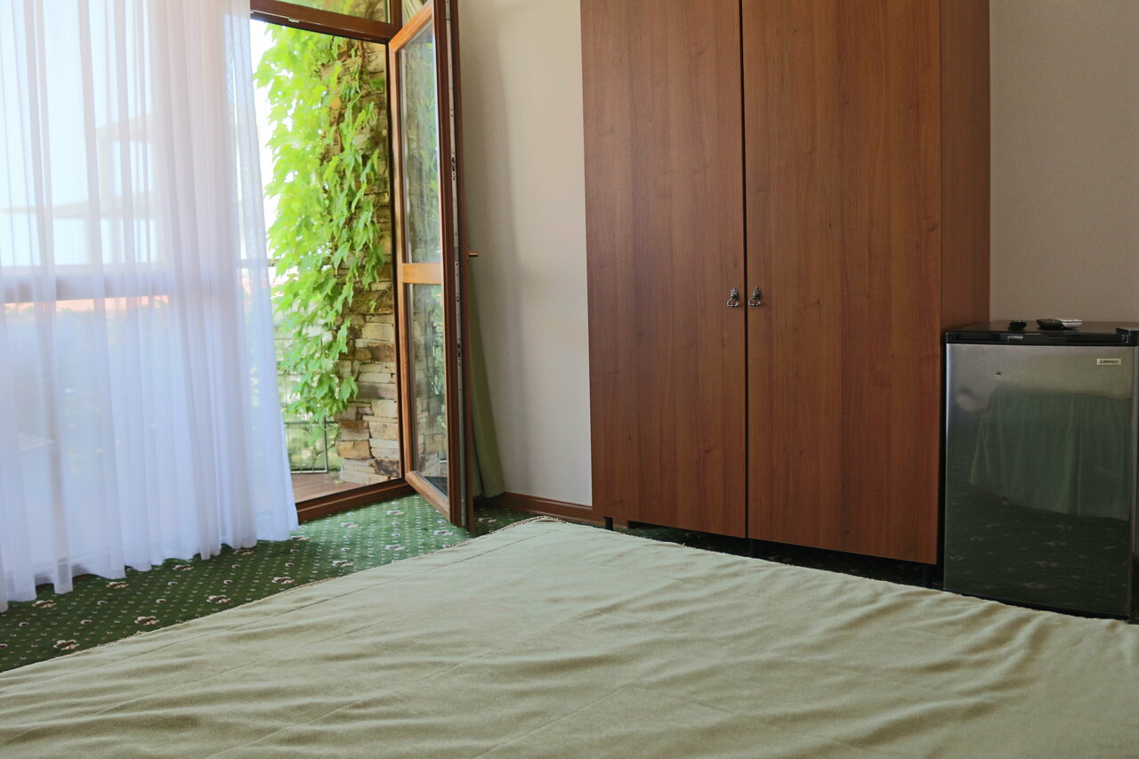 Приехали на один день.знаю,что в сезон это проблематично. Но нас встретили прекрасно. Номер с выходом на террасу.Зеленый,уютный дворик. В номере чисто.комфортно. Есть кухня общая. До моря идти близко.горочка небольшая. Пляж морской уголок.