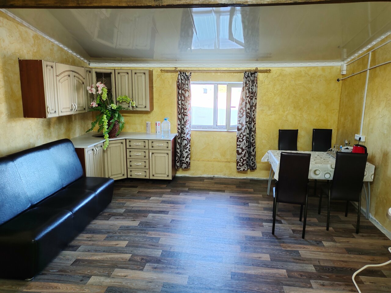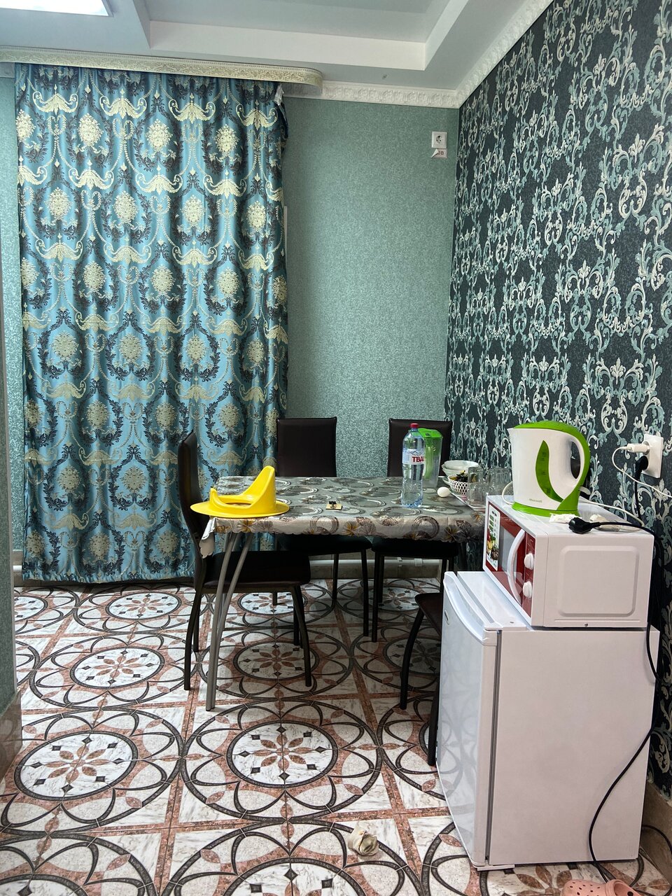 Номер не плохой,но грязно,пол липкий,пыль везде,стоит фильтр для воды весь в пыли,посуда в пыли,стулья железные ужасные,в ванной комнате запах,смеситель на умывальнике не работает,вода течёт прямо на пол,в душевой смеситель работал но весь ободраный,за 1ночь 3 тыс за этот номер конечно дорого,но люди уставшие с дороги,ночь,на это хозяева и расчитывают