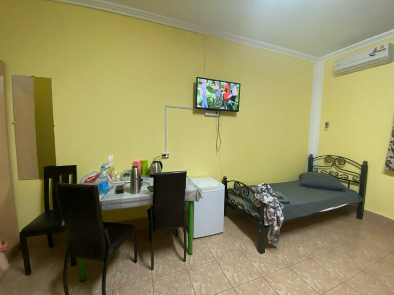 Номер просторный, на 5 человек уютно. Плюсы: микроволновка холодильник, чайник, тв и кондиционер. Кровати супер. Минус: душ без крепления дверь сломан замок.
