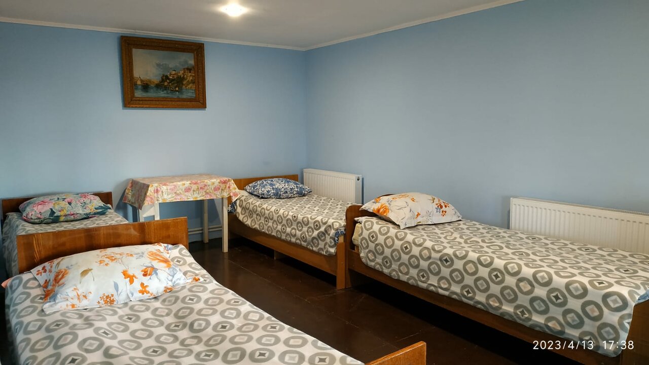 Одна из самых просторных комнат. Помимо кроватей имеется двуспальный диван. Комната отлично подойдет для проживания семьи из 4-х человек. К услугами гостей чайные наборы и халаты.