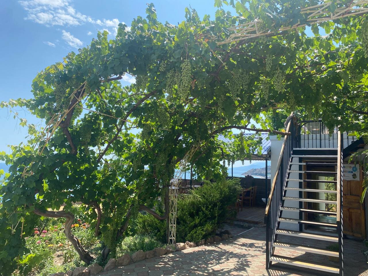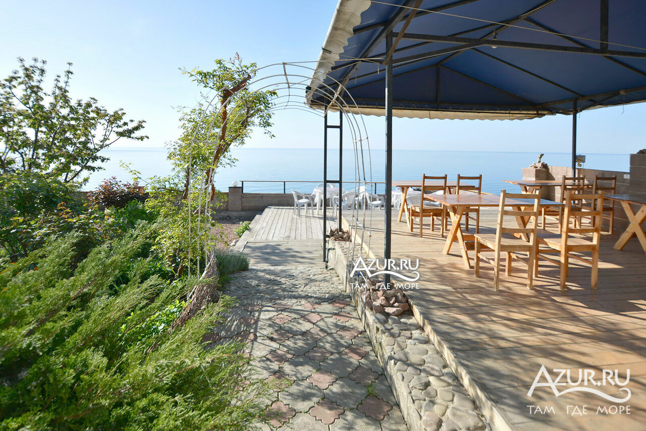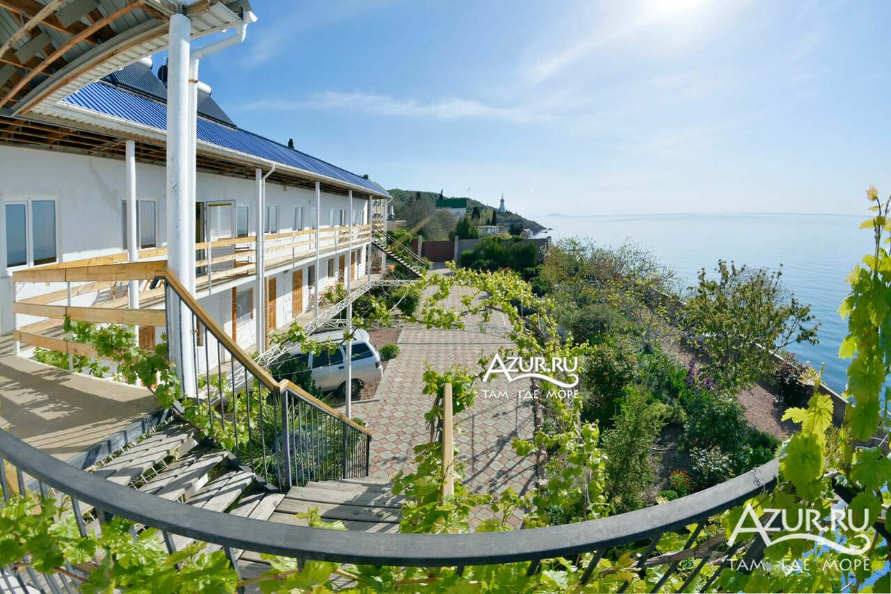 Шикарный вид с террасы. Просторные номера, вода круглосуточно, общая кухня. Красивая и ухоженная территория. До магазинов 500метров. Крутой спуск по ступеням к морю прямо от гостиницы. 100 метров городской пляж.