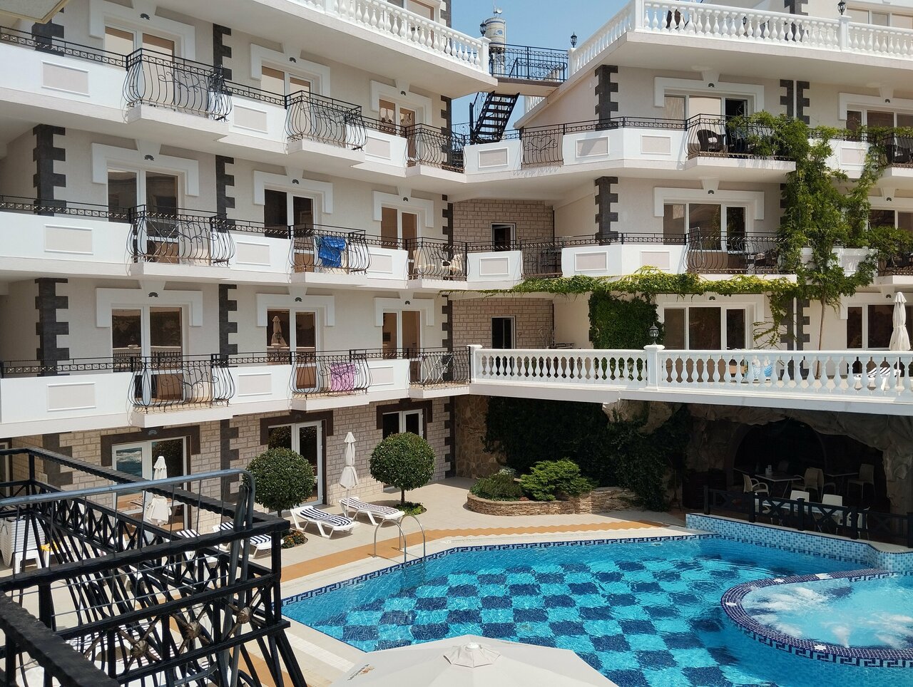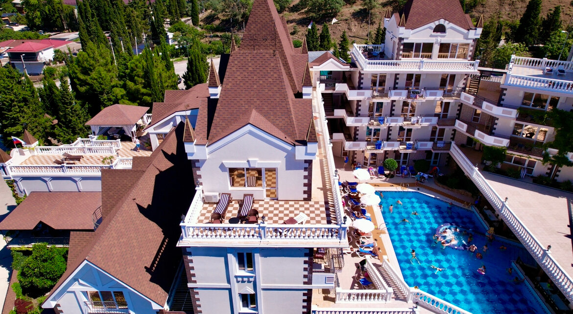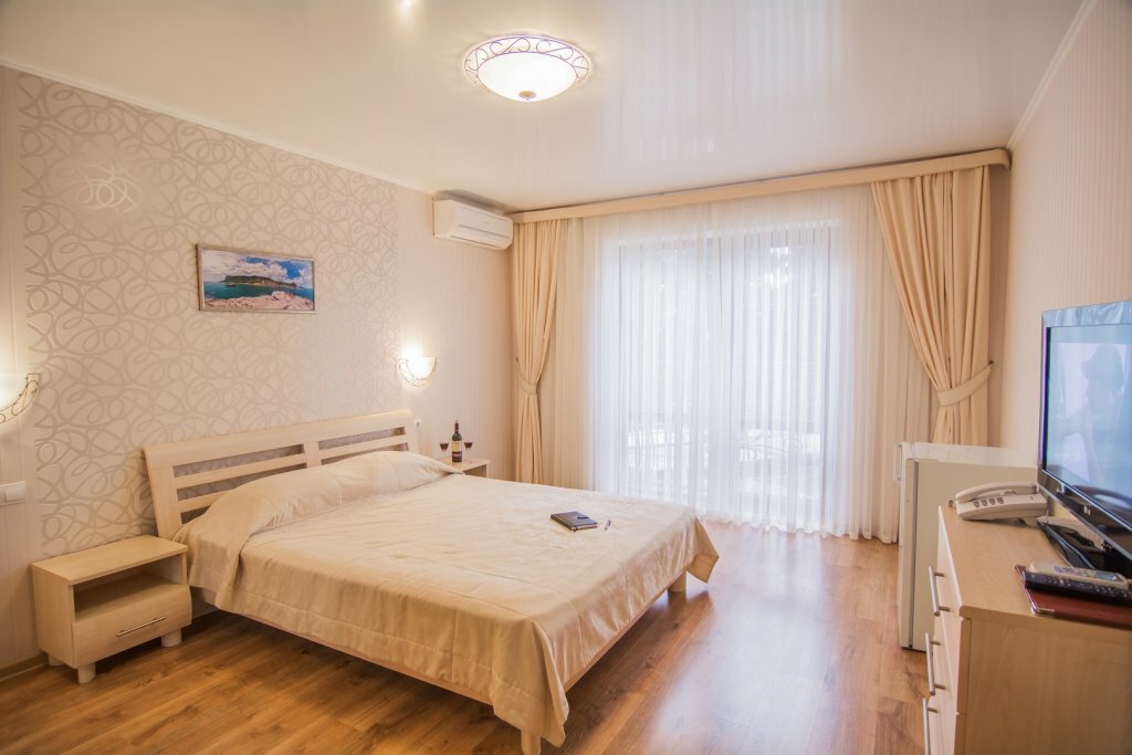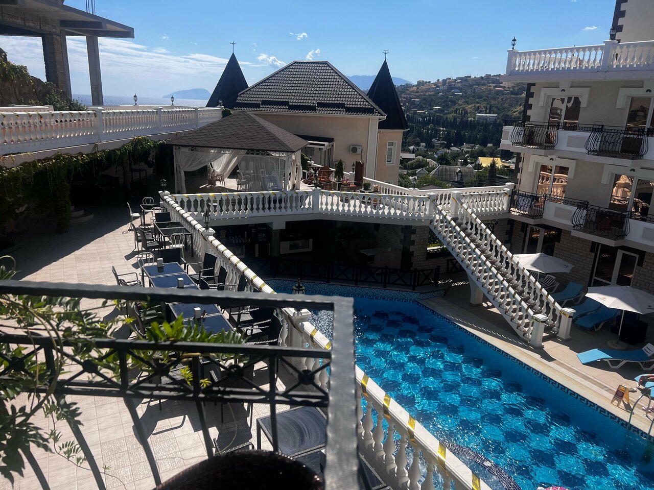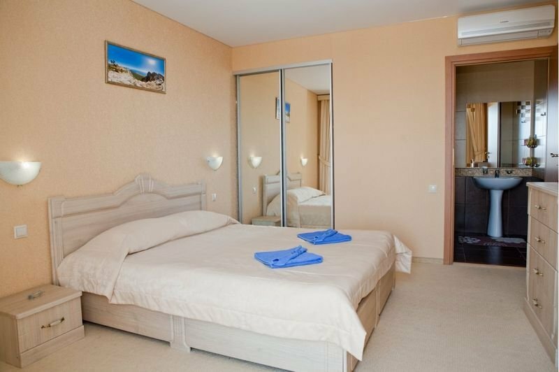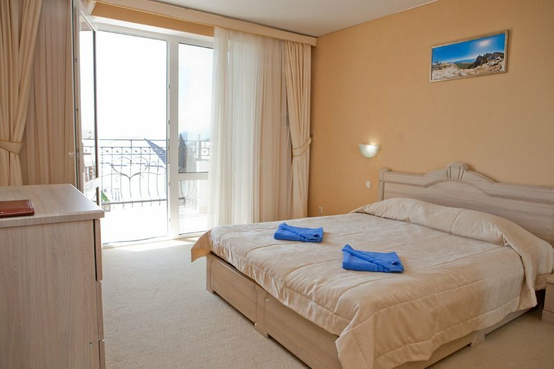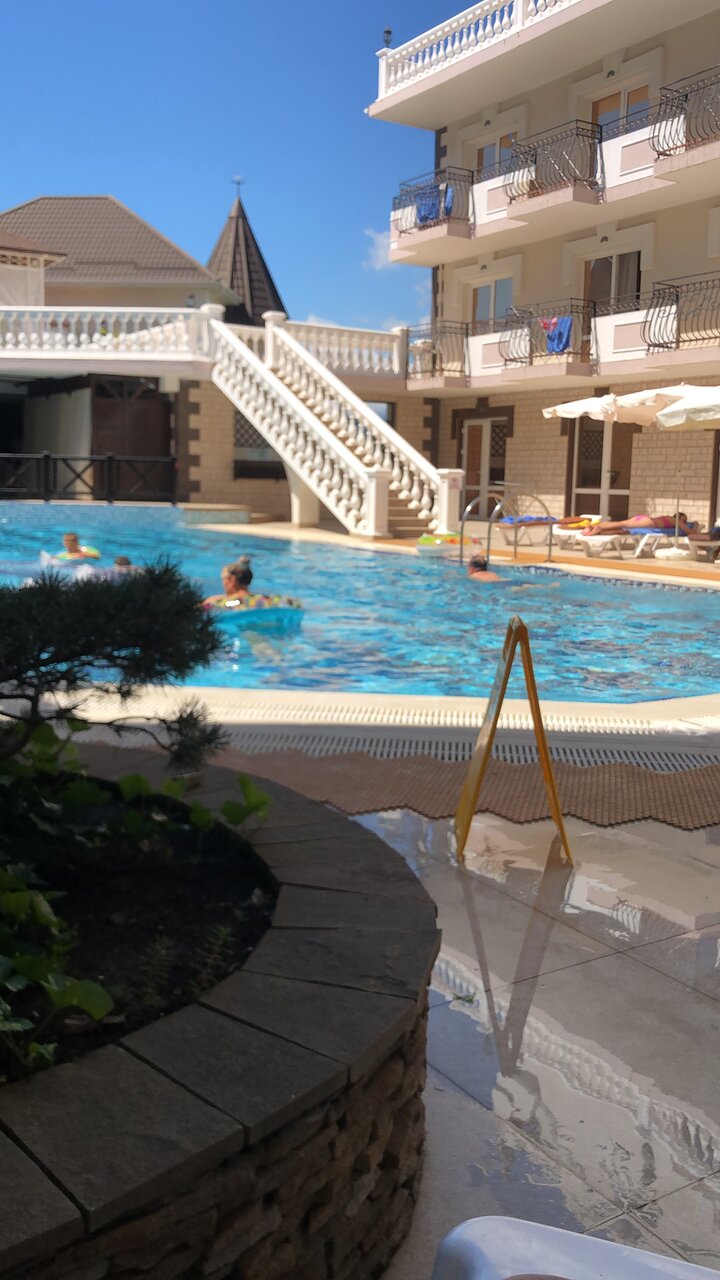 Отель замечательный, для Крыма просто ВАУ. Комфортные номера, персонал очень отзывчивый и дружелюбный. Уборка номеров каждый день, смена белья 1 раз в 3 дня, везде очень чисто. Чистый и большой бассейн. Ресторан и бар с напитками у бассейна. По отелю минусов нет. А вот море и пляж оставляет желать лучшего, на пляже отеля можно пользоваться шезлонгами, полотенца для моря и пляжа выдаются в отеле. Сам пляж галька+песок, вход в море — крупные камни, без обуви заходить очень неприятно. А самое главное в море на пляже стекает канализация и следовательно, ротавирусная инфекция Вам обеспечена. Хорошие пляжи с чистой водой 1.5-2 км от отеля.