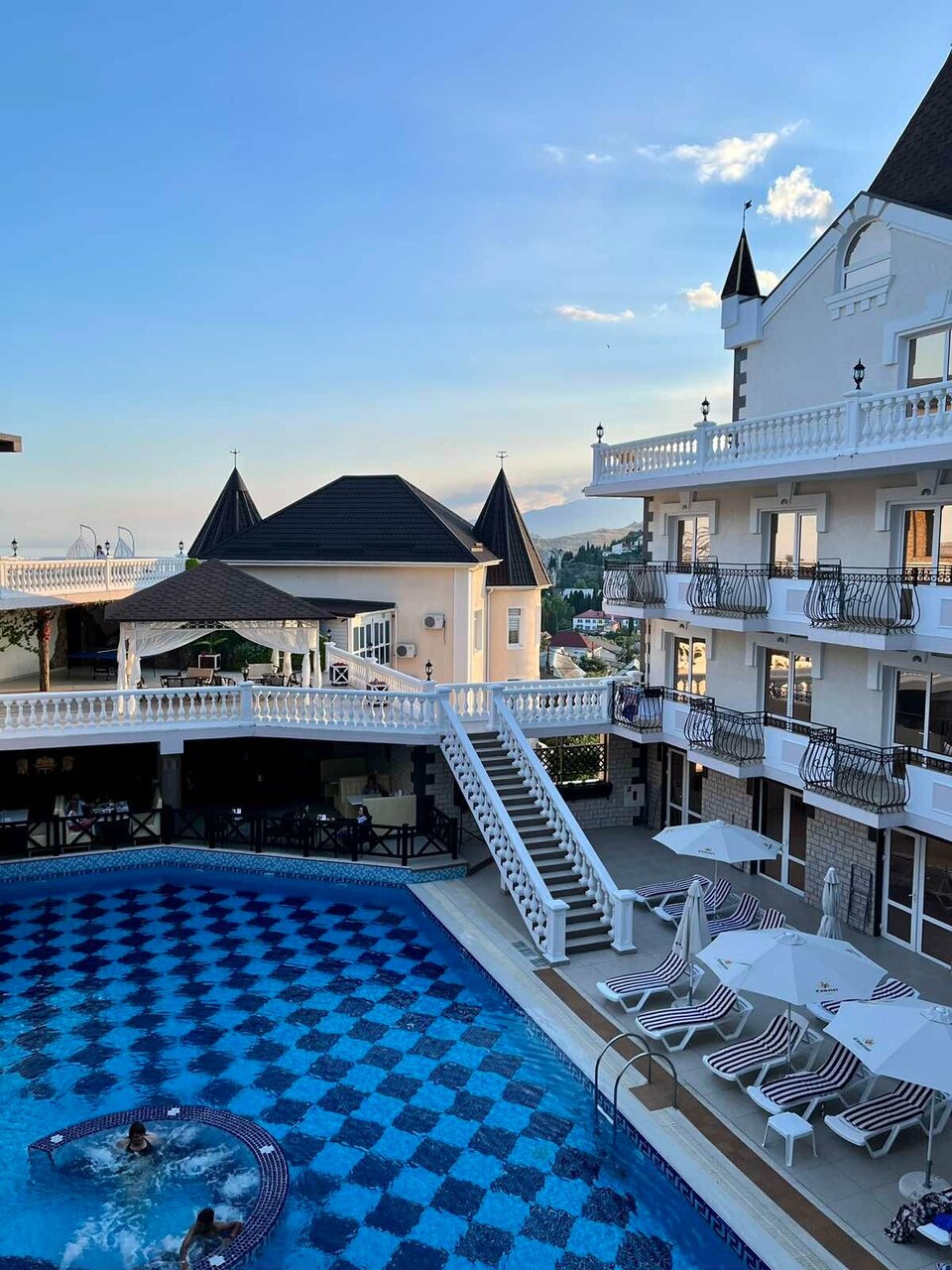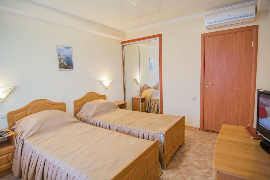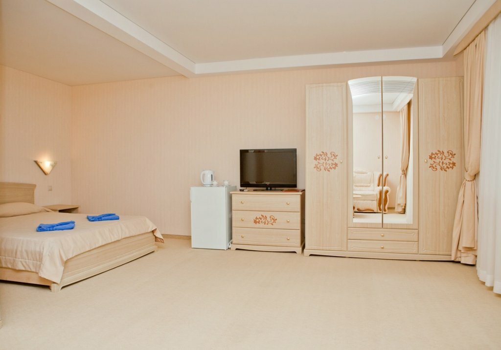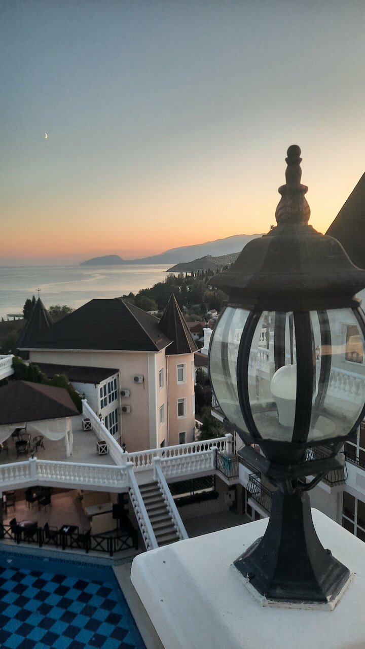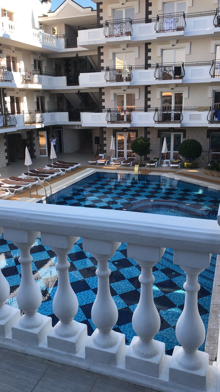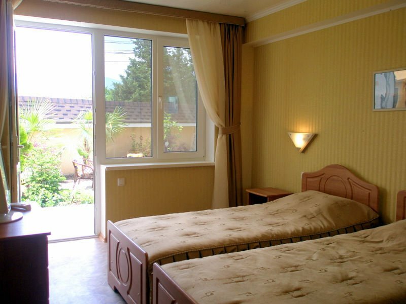 Отель замечательный, для Крыма просто ВАУ. Комфортные номера, персонал очень отзывчивый и дружелюбный. Уборка номеров каждый день, смена белья 1 раз в 3 дня, везде очень чисто. Чистый и большой бассейн. Ресторан и бар с напитками у бассейна. По отелю минусов нет. А вот море и пляж оставляет желать лучшего, на пляже отеля можно пользоваться шезлонгами, полотенца для моря и пляжа выдаются в отеле. Сам пляж галька+песок, вход в море — крупные камни, без обуви заходить очень неприятно. А самое главное в море на пляже стекает канализация и следовательно, ротавирусная инфекция Вам обеспечена. Хорошие пляжи с чистой водой 1.5-2 км от отеля.