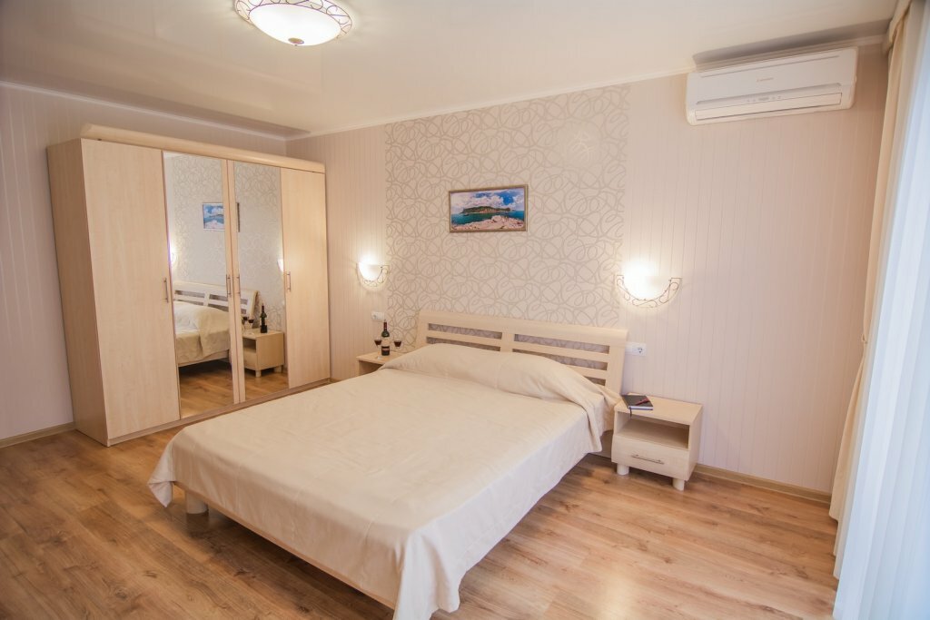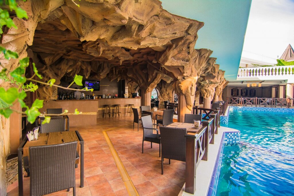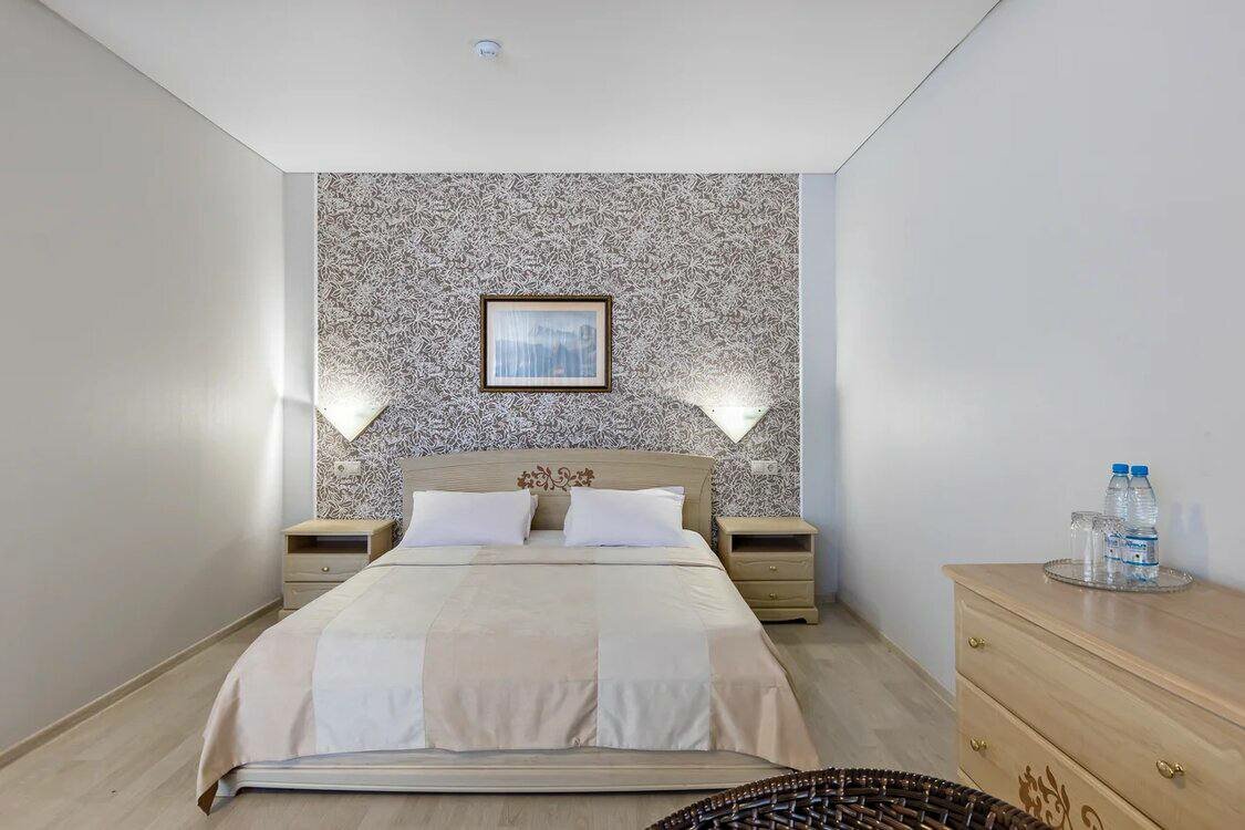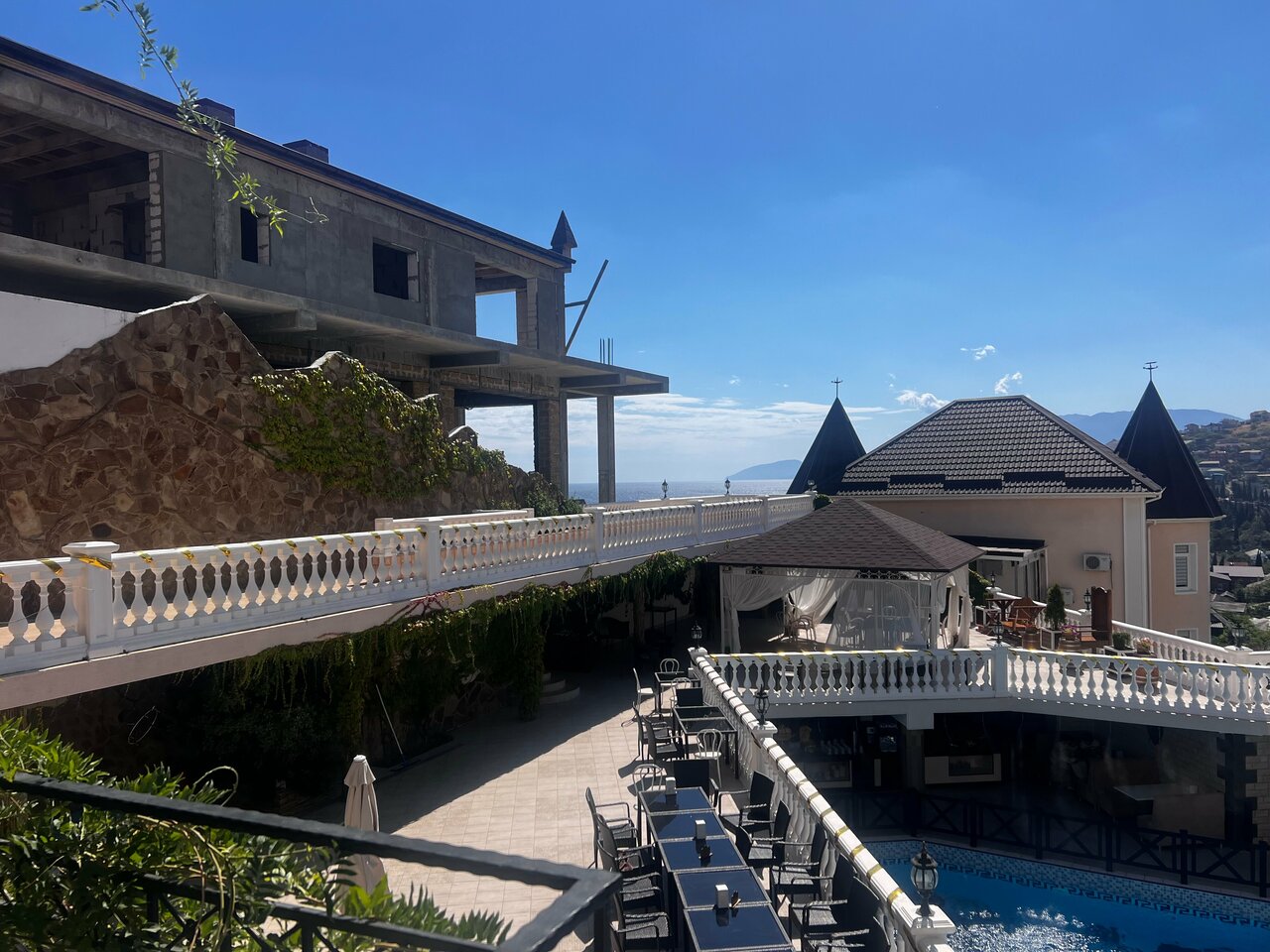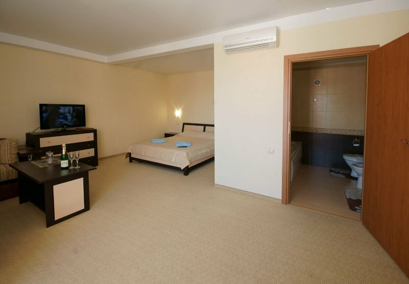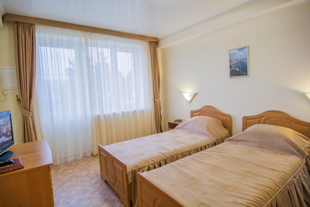 Отель замечательный, для Крыма просто ВАУ. Комфортные номера, персонал очень отзывчивый и дружелюбный. Уборка номеров каждый день, смена белья 1 раз в 3 дня, везде очень чисто. Чистый и большой бассейн. Ресторан и бар с напитками у бассейна. По отелю минусов нет. А вот море и пляж оставляет желать лучшего, на пляже отеля можно пользоваться шезлонгами, полотенца для моря и пляжа выдаются в отеле. Сам пляж галька+песок, вход в море — крупные камни, без обуви заходить очень неприятно. А самое главное в море на пляже стекает канализация и следовательно, ротавирусная инфекция Вам обеспечена. Хорошие пляжи с чистой водой 1.5-2 км от отеля.