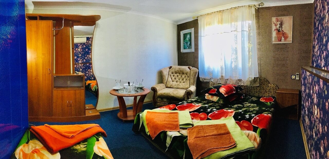 Приезжаем с мужем и сыном третий год подряд и приедем еще )))) Невероятно красивый двор:)Все украшено цветами, растениями, деревьями. Что касается номера — чистый. светлый, имеется кондиционер, своя отдельная кухня, плита, посуда и т.д. Это очень удобно, особенно когда у тебя маленький ребенок, родители меня поймут) Так как мы жили на втором этаже плюсом ко всему шел балкончик со своим столиком. Сидишь спокойно попиваешь чаек и читаешь книгу, просто восторг:). Огромный плюс в расположении гостиницы, так как до моря мы шли буквально 7 минут, через парк! Очень благодарны хозяевам, Сергею и Алене за созданный уют на отдыхе и вкусные вареники)))))Спасибо!!!