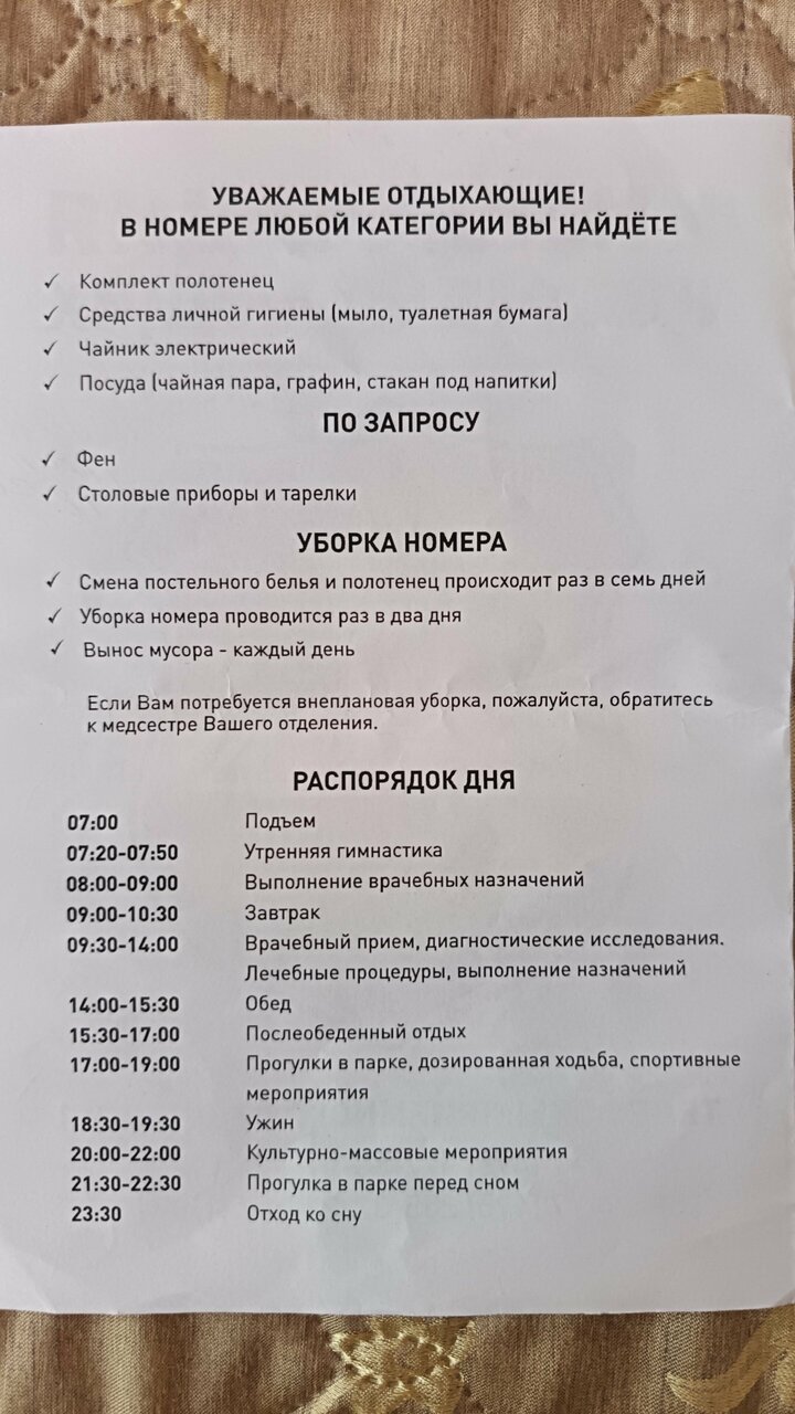 Санаторий большой. Состоит из трёх спальных корпусов. Медицинский корпус и три столовые находятся внутри санаторного здания.Разнообразие процедур недостаточное. Питание заказное, скромное. Кто любит покушать, будет искать дополнительное питание. Бассейн большой, красивый. Здания санатория требуют ремонт. И внедрение современных технологий. Пока всё по старинке. Хотя территория большая, ухоженная. Много цветов.