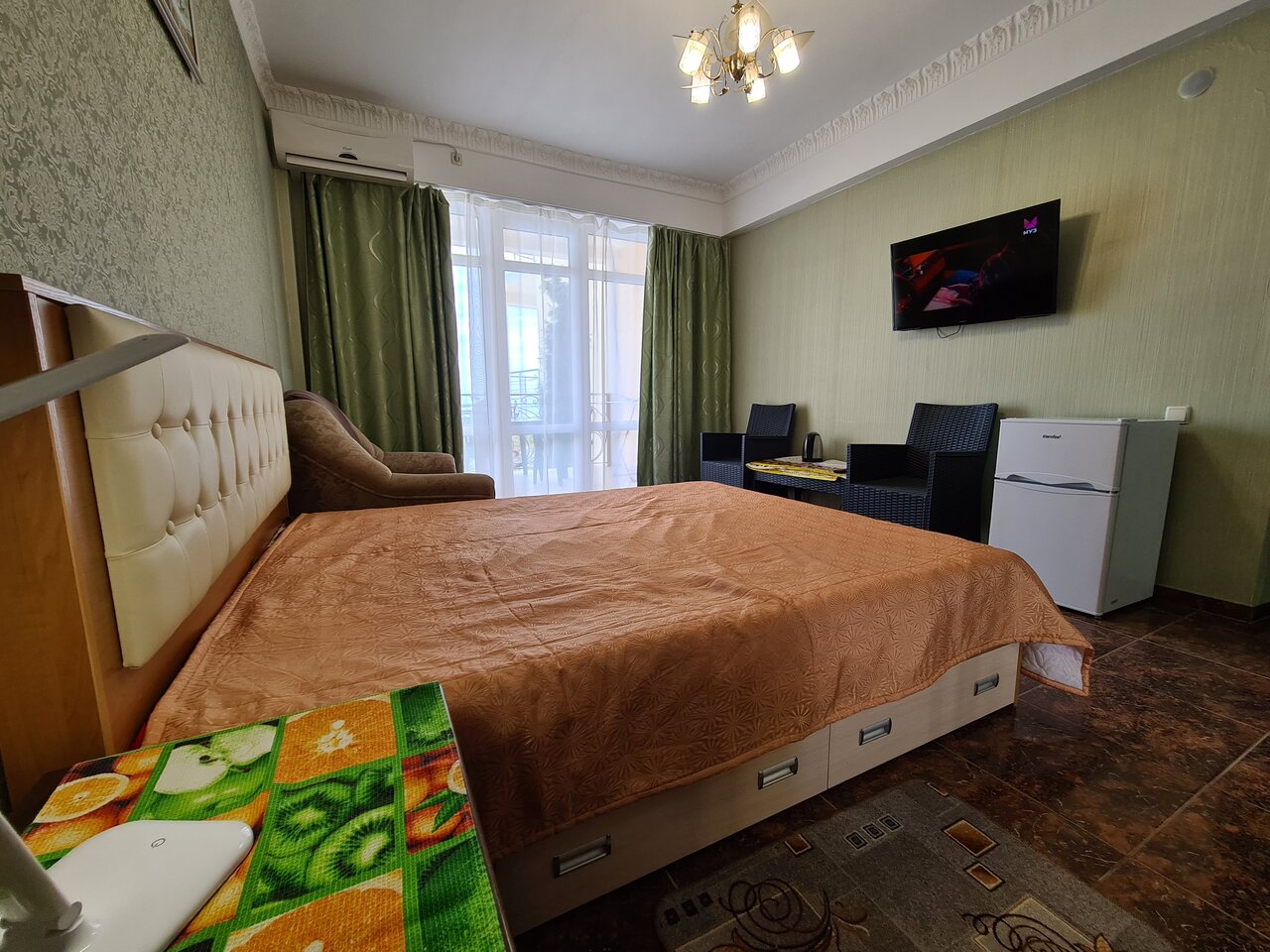 Цены уточняйте по телефону Апартаменты Люкс класса с Балконом и панорамным видом на мореВместимостью до 3х человек - Большая двуспальная кровать + раскладной диван.Расположены на 2, 3 этажахОткрывается прекрасный вид на горный заповедник