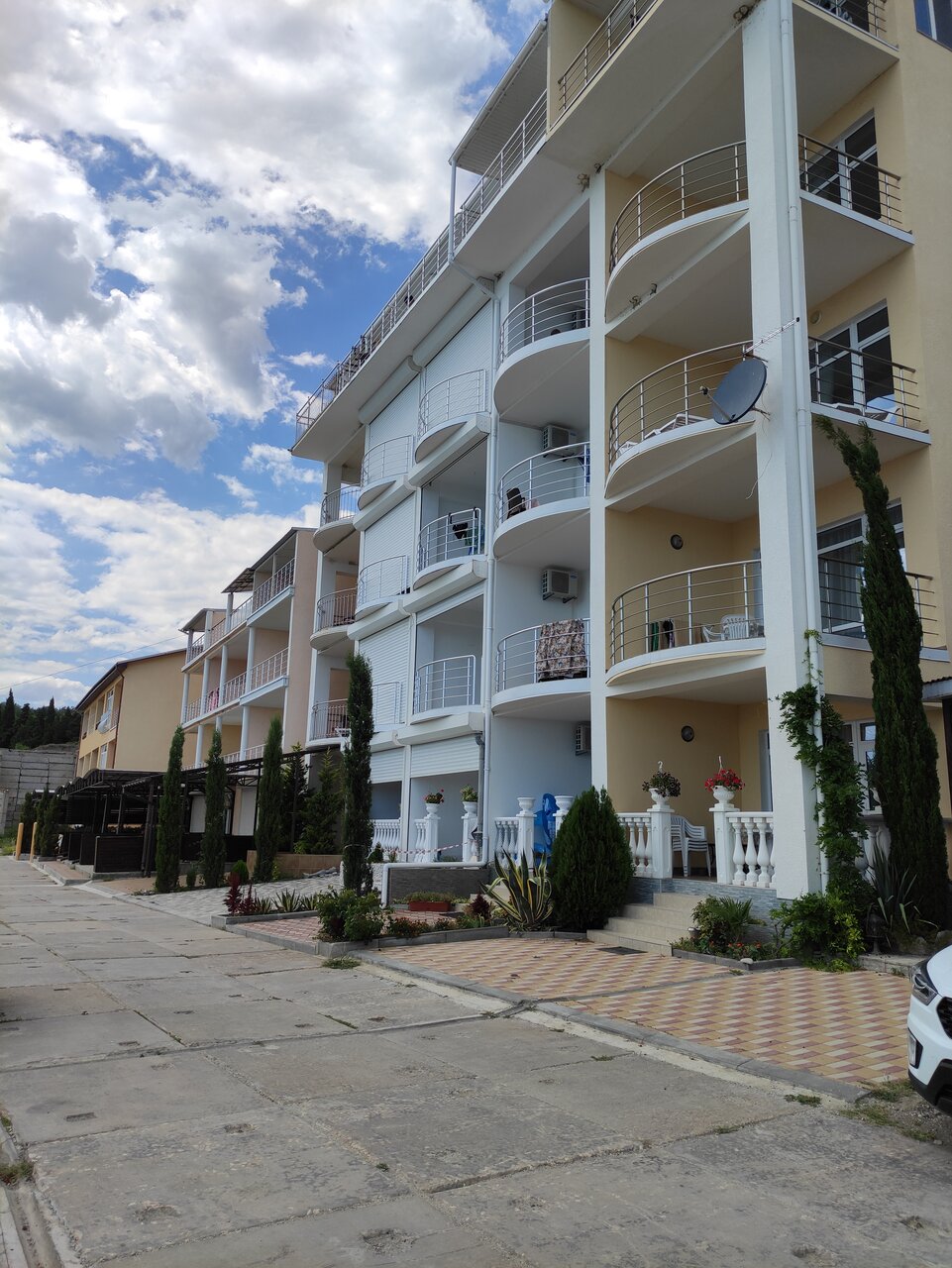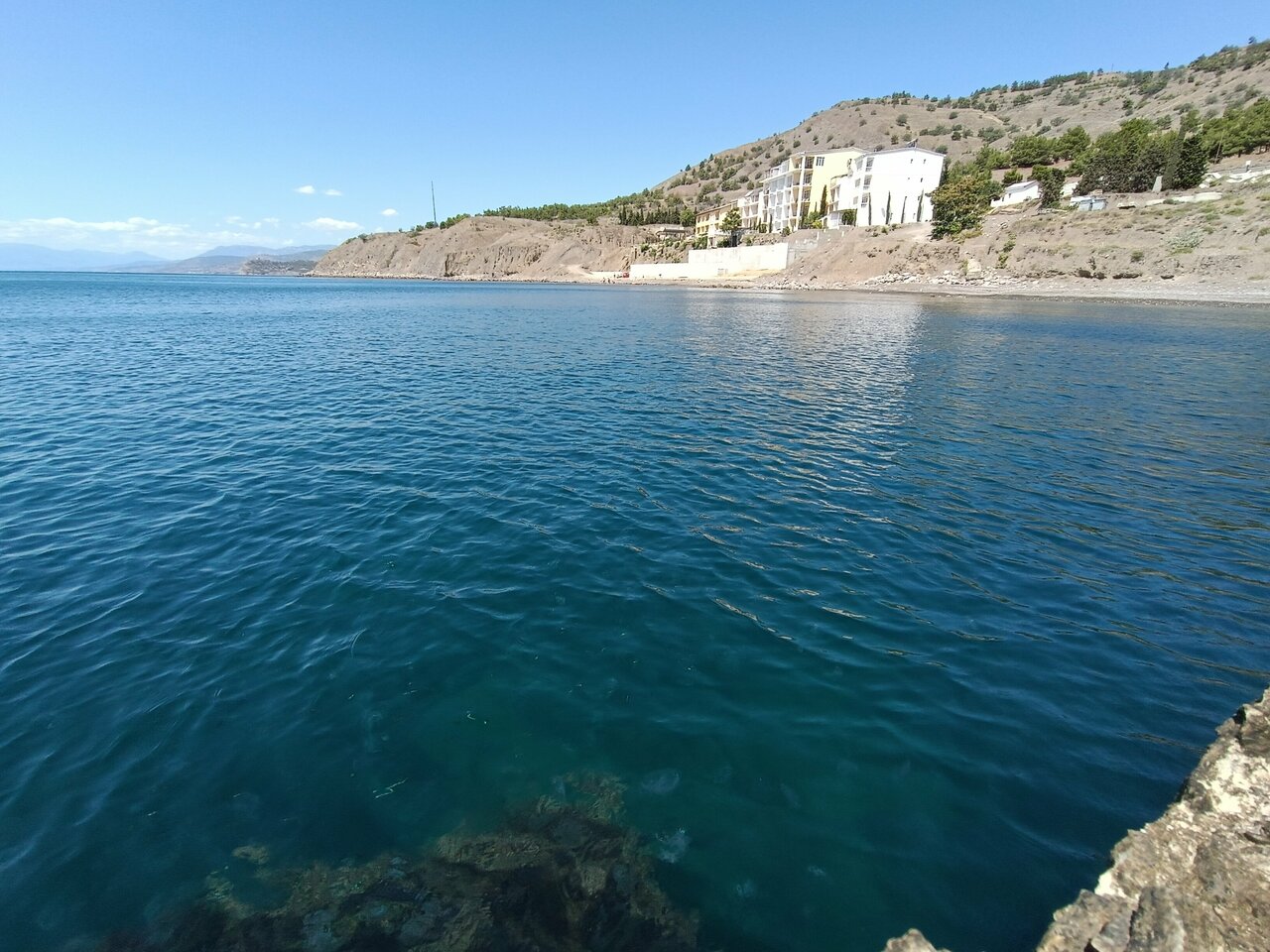 Замечательное место, мало народу, очень спокойно, чистые большие номера с видом на море. До пляжа 50 метров, пляж конечно не для детей, везде камни. Есть кафе, парковка, магазин, охрана. До посёлка Морское 5-7 минут пешком. Очень понравилось.