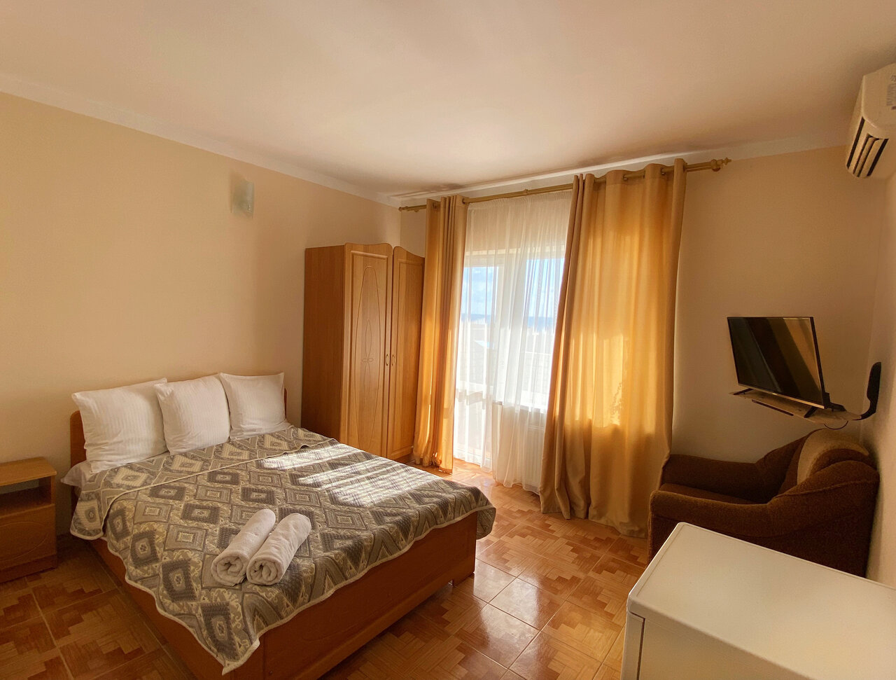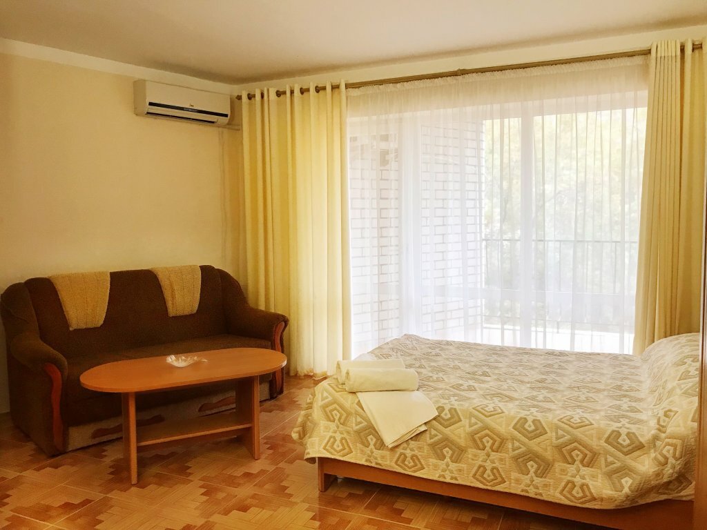 Это чудесное место для отдыха с маленькими детьми!!!! Тишина, шум прибоя, пение птиц, зелёные деревья (киви, гранат, грецкий орех, миндаль, фундук, инжир, груша, виноград, хурма), розы и другие цветы. Большая территория с 4-мя корпусами с бассейном (детским и взрослым), бильярдной, сауна (за отдельную плату) рекомендую погреться, теннис настольный, летние кухни, стиральные машинки на этажах, детская площадка (до 3-ех лет) и песочница. Для взрослых есть большие качели как в тени зелёных насаждений, так и на горе с видом на море!!! Снимали 2-ух комнатный полулюкс с двумя 2-ух спальными кроватями, душ и удобства в номере. Завтрак входил в стоимость проживания, обедали и ужинали тоже в комплексе на открытой террасе с видом на море!!!! Кормили ооооооооочень вкусно и разнообразно, блюда за 10 дней проживания почти не повторялись!!! Всегда интересовались, что нам приготовить!!! Хотите отдохнуть от суеты, Вам точно сюда!!!!