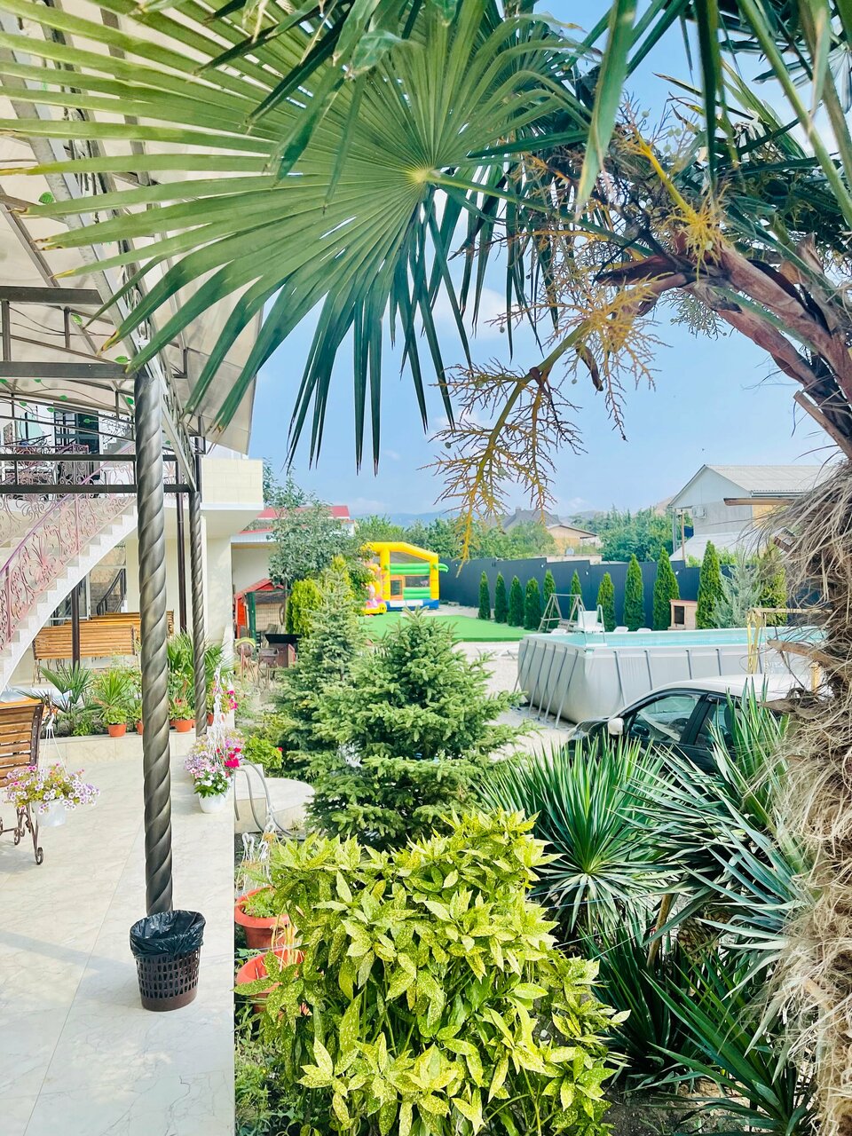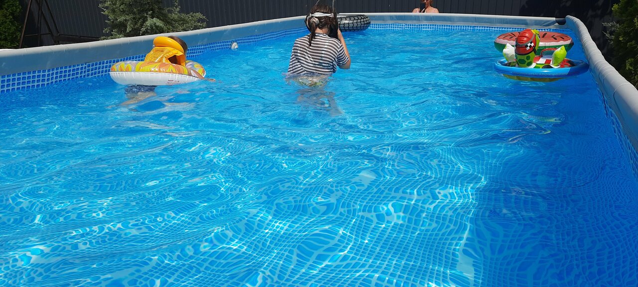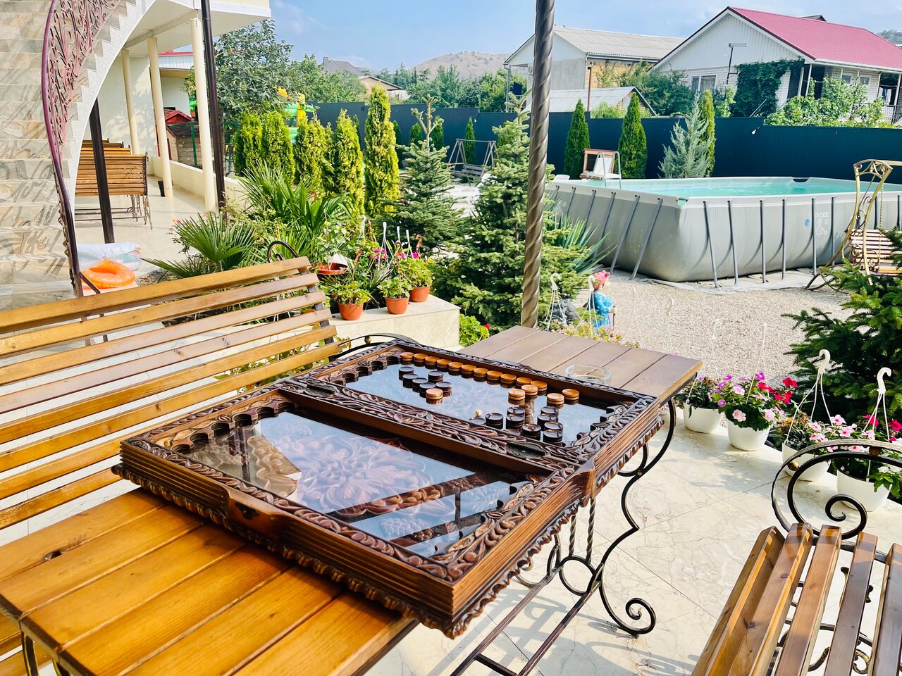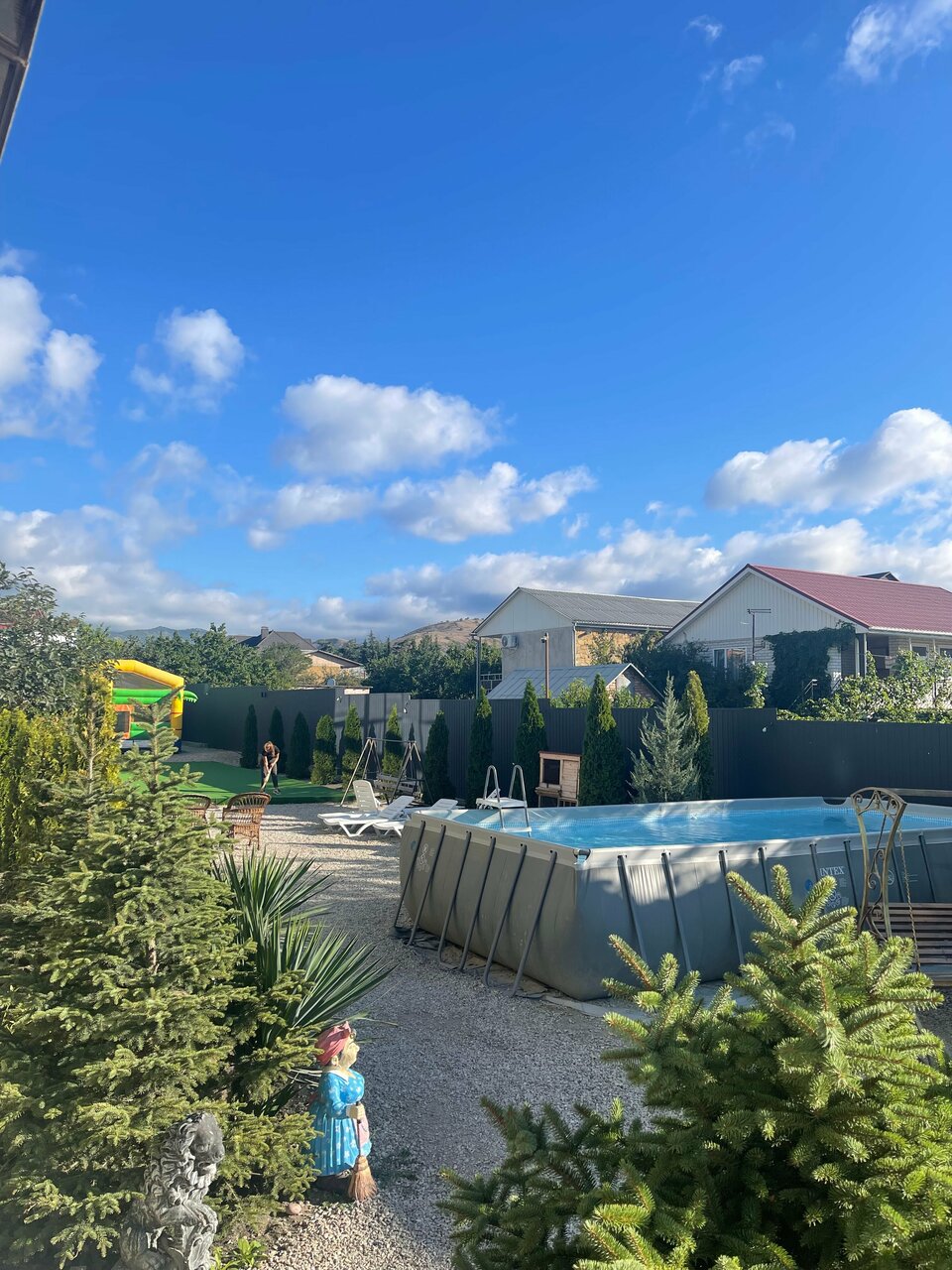 - Бассейн и качели на территории.