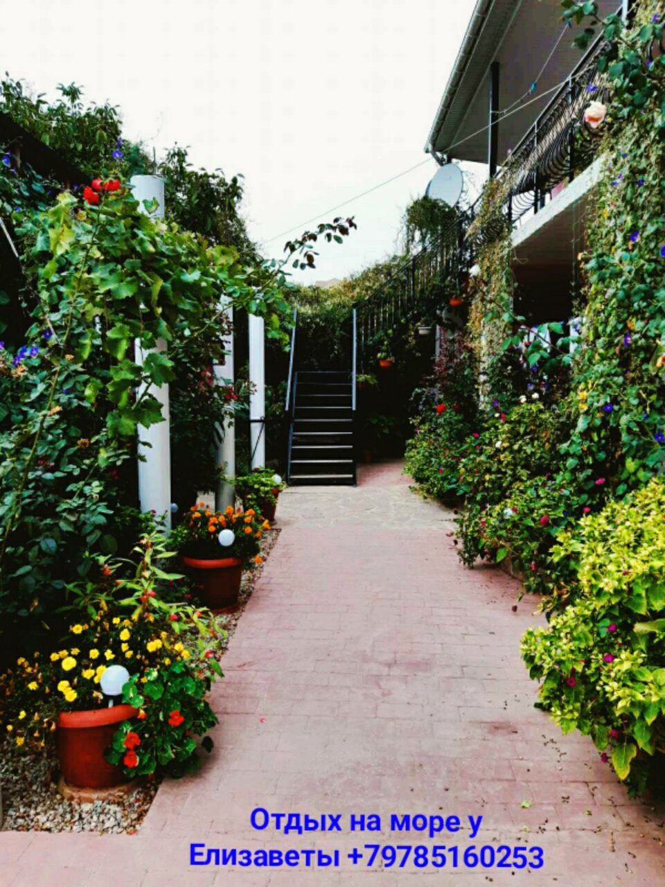 - Уютный двор с цветами и растениями.