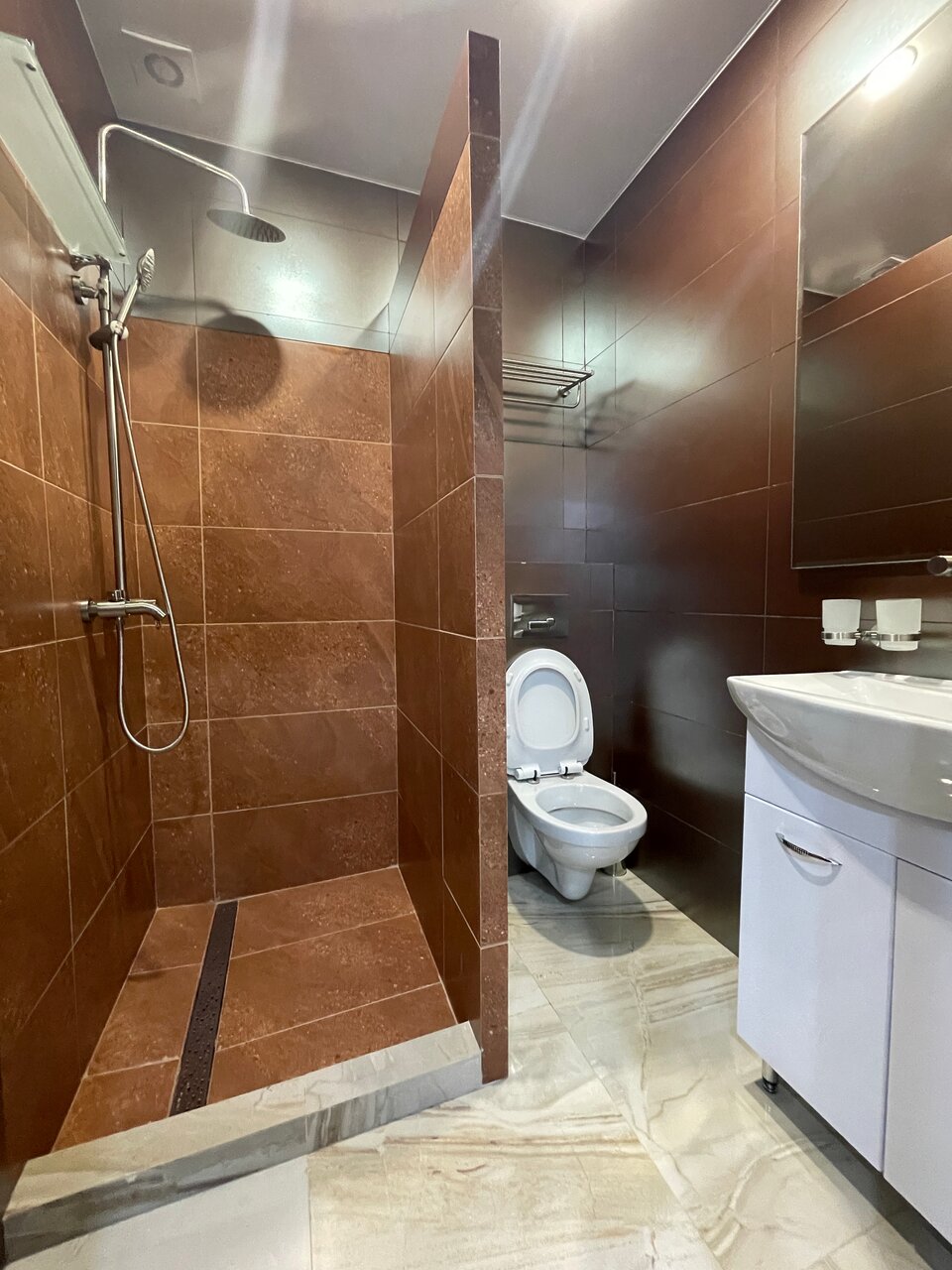 Телевизор, холодильник, душевая кабина, средства гигиены, тапочки