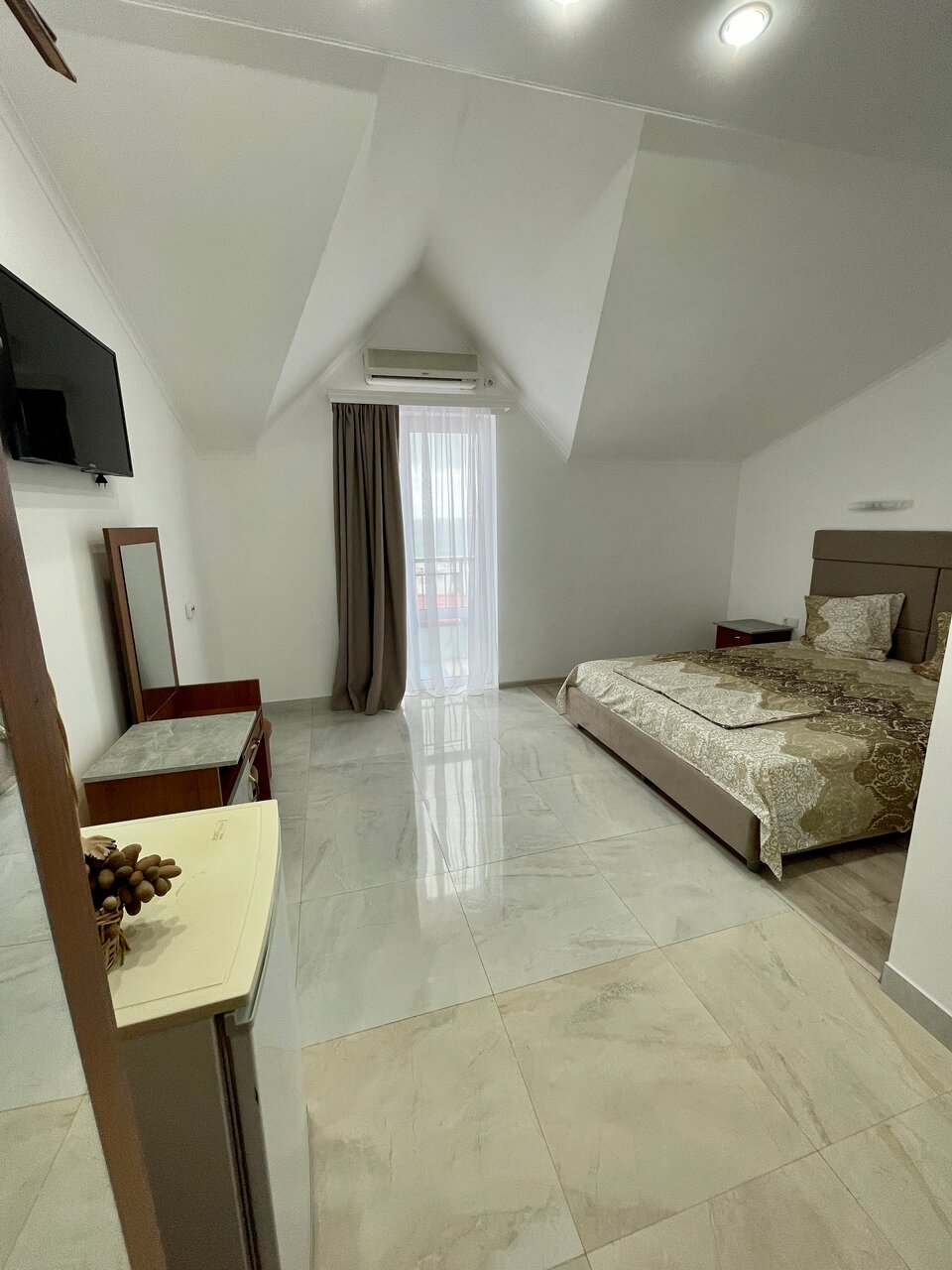 Из плюсов: внизу столовая, через дорогу море. Из минусов: в номере грязновато, кондиционер работает еле-еле, розетки глубокие- не могли вставить зарядное для мобильных (выход- тройники)