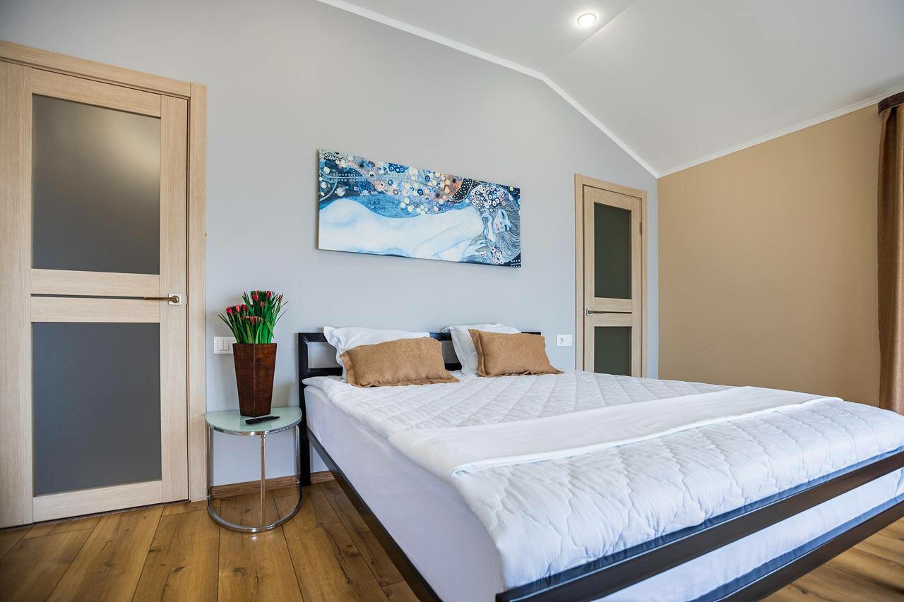 Современный ремонт, удобная кровать, аккуратный санузел. На первом этаже комфортная кухня. До моря 3 минуты и сразу на центральном пляже. Из минусов немного шумно может быть, не убирают в номере, не меняют бельё, всё самим.