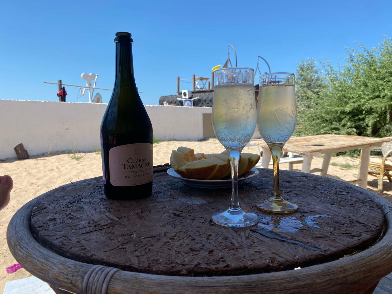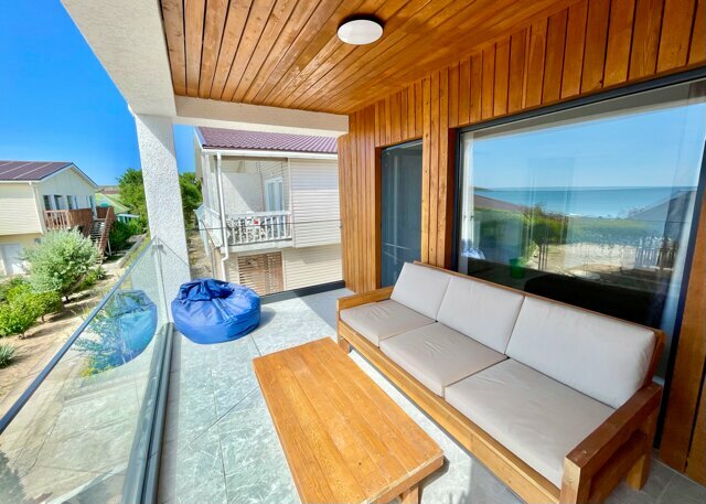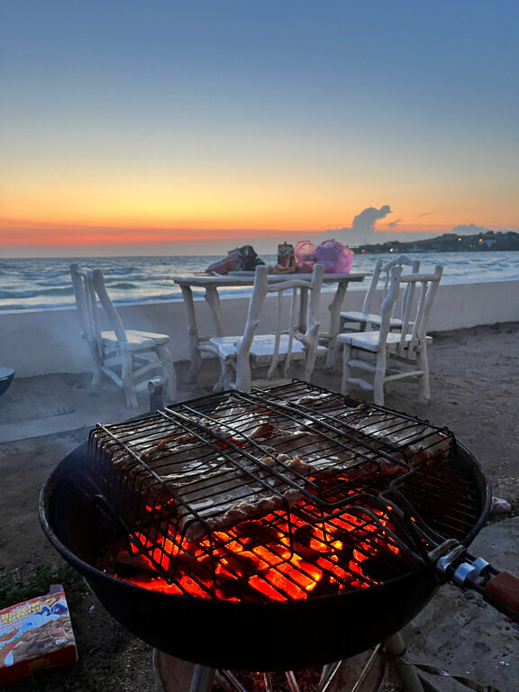 Очень красивый вид с балкона на море, где можно по вечерам наблюдать закат. Жили в новой постройке на втором этаже, чисто , уютно , приятно. Есть своя мангальная зона, а так же выход на пляж с удобными лежаками) можно покататься на всяких интересных штуках — типа кайта, виндсерфа, катамарана и тд. Хорошее место