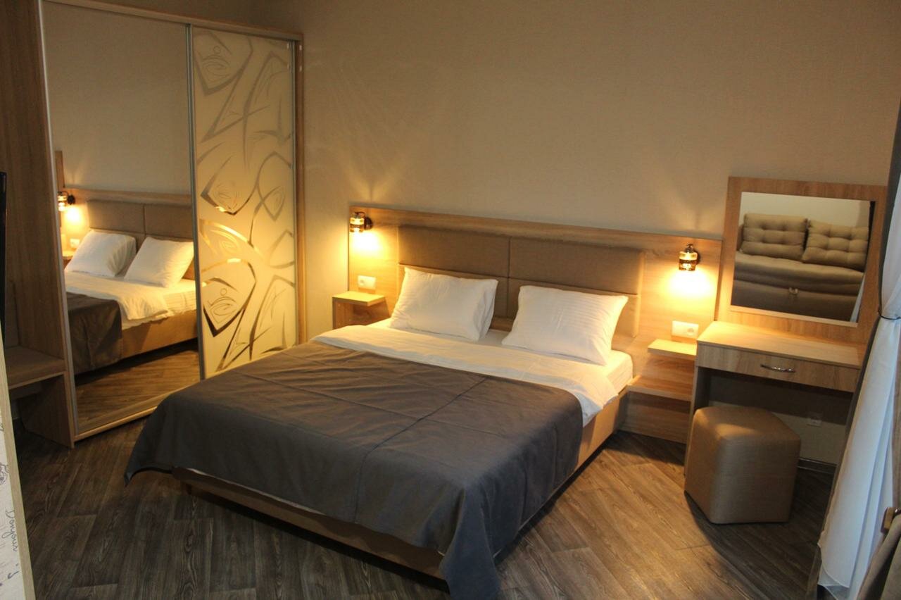 Двухместный номер площадью 22 м2, в том числе ванная комната 3,5 м2. В номере: одна двуспальная кровать размером 160 х 200 (Double) или две односпальные кровати размером 90 х 200 (Twin), прикроватные тумбочки, стол, стулья, шкаф, мини-кухня, холодиль