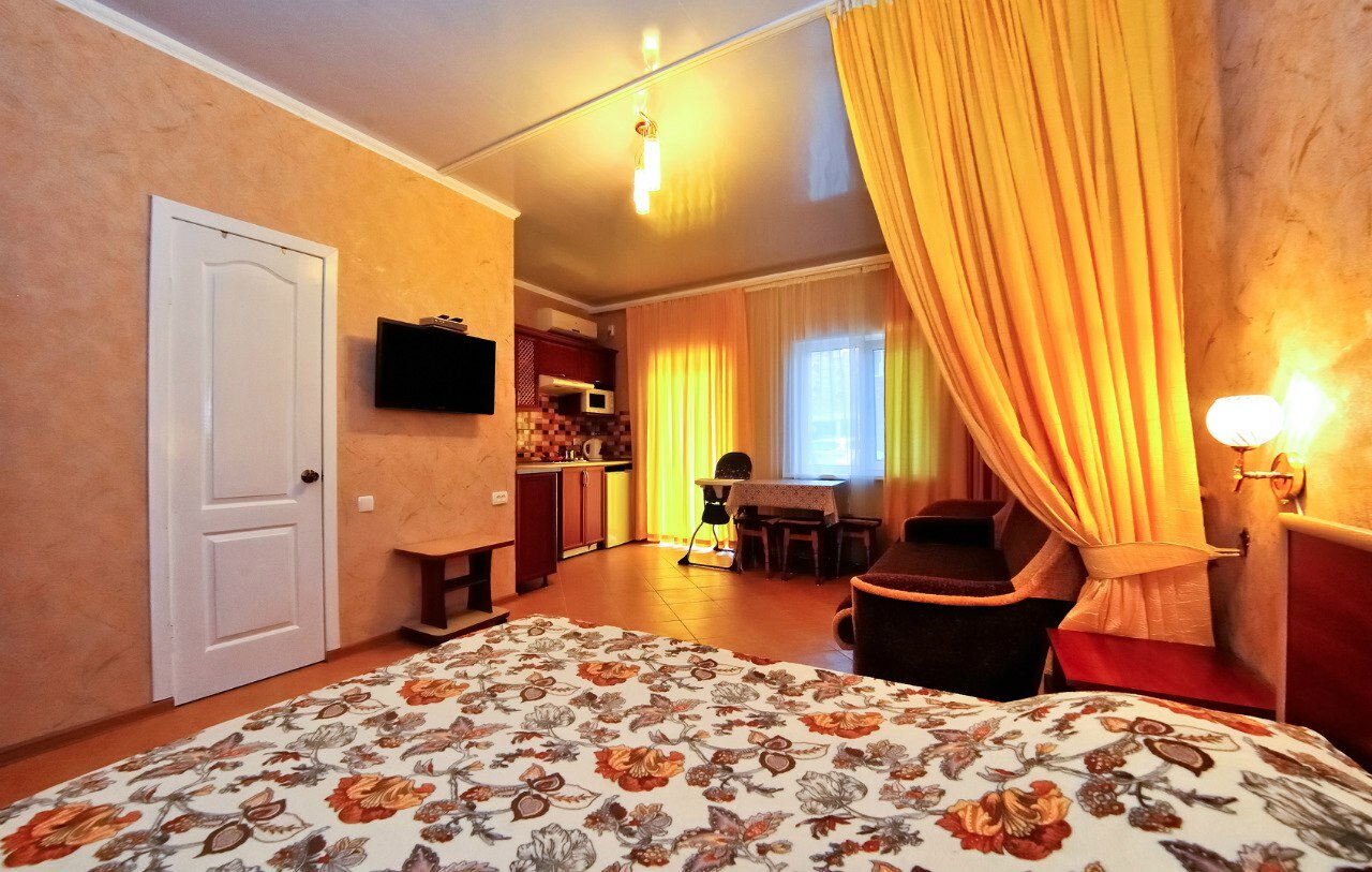Отдали в августе, 2021 года. Понравилось, проживали в номере со своей территорией, где была беседка и монгал, территория только для нас. Номер большой два входа на улицу и во двор очень хорошо посидеть вечером пожарить шашлыки. До Щелкино пешком по дороге или пляжу 10 минут не больше. Море рядом, но было много медуз, пляж прибегают все чисто. Можно рекомендовать друзьям!